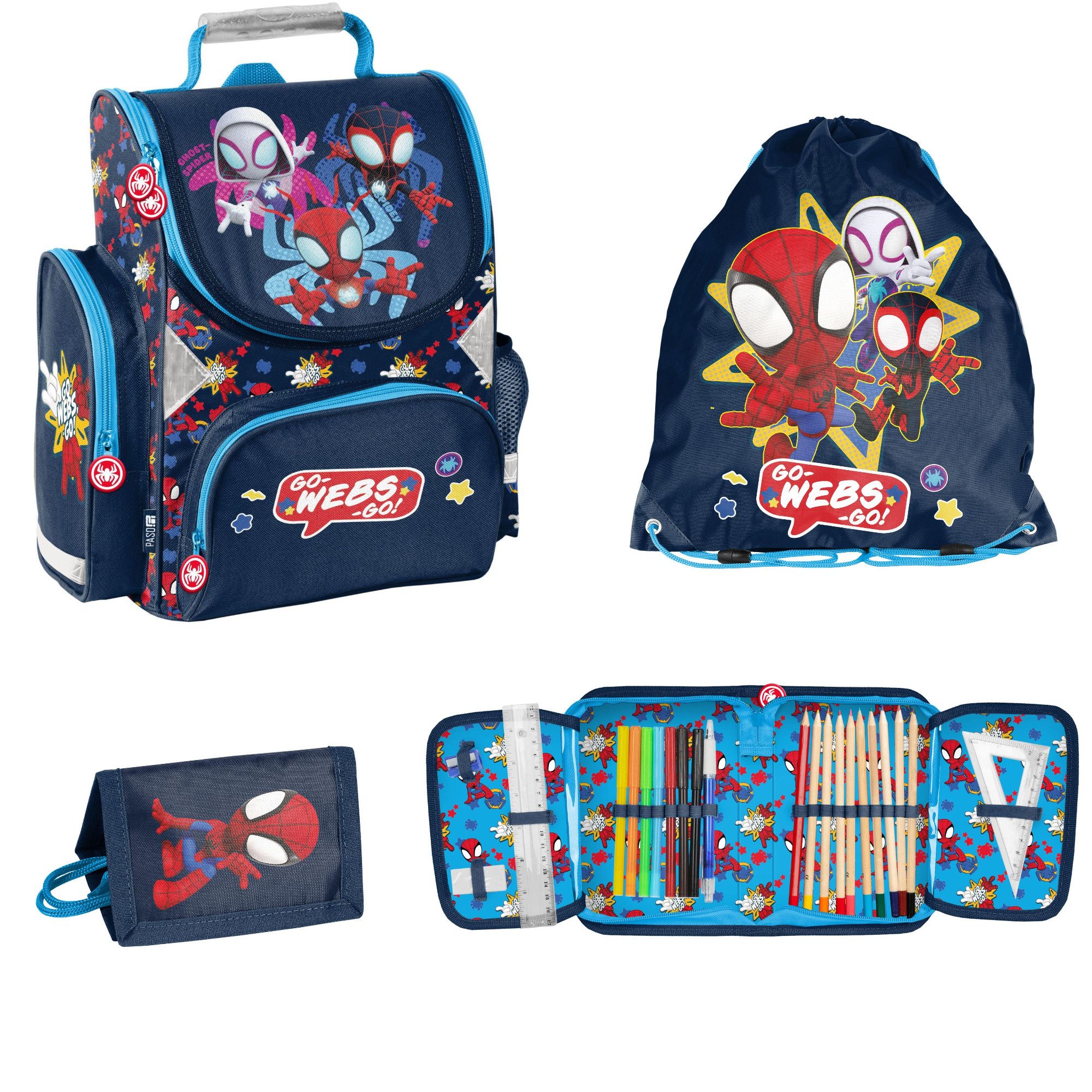 4-TEILIGES KINDERSET: RUCKSACK + TURNBEUTEL + FEDERMAPPE + PORTEMONNAIE - SPIDEY- BLAU / BUNT