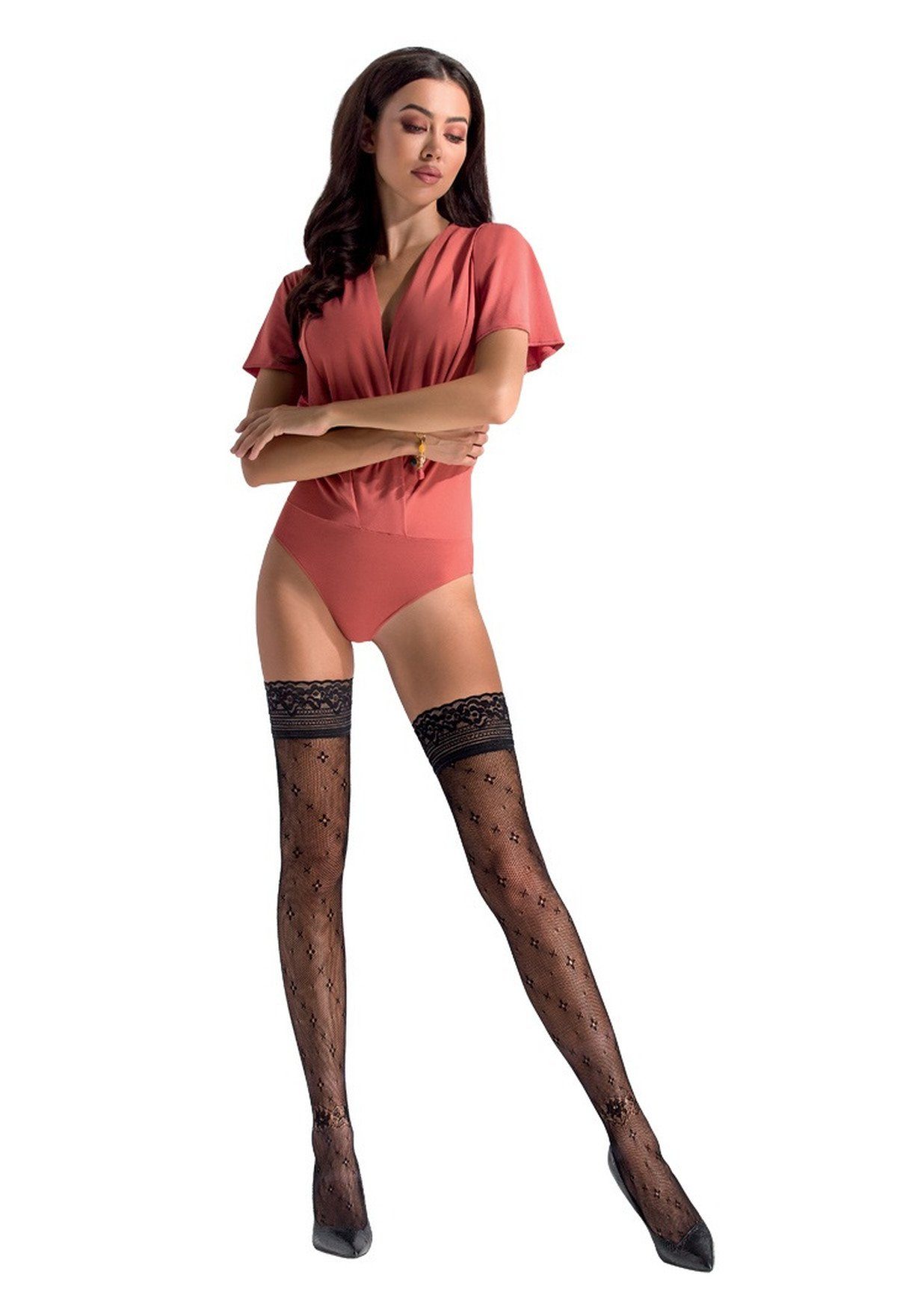 Verführerische schwarze halterlose Strümpfe mit ansehnlichen Mustern verziert Obenrum mit einem verführerischen Spitzenrand versehen Mit Silikon Größe: S/M, L/XL Farbe: schwarz Material: 92% Nylon, 8% Elasthan