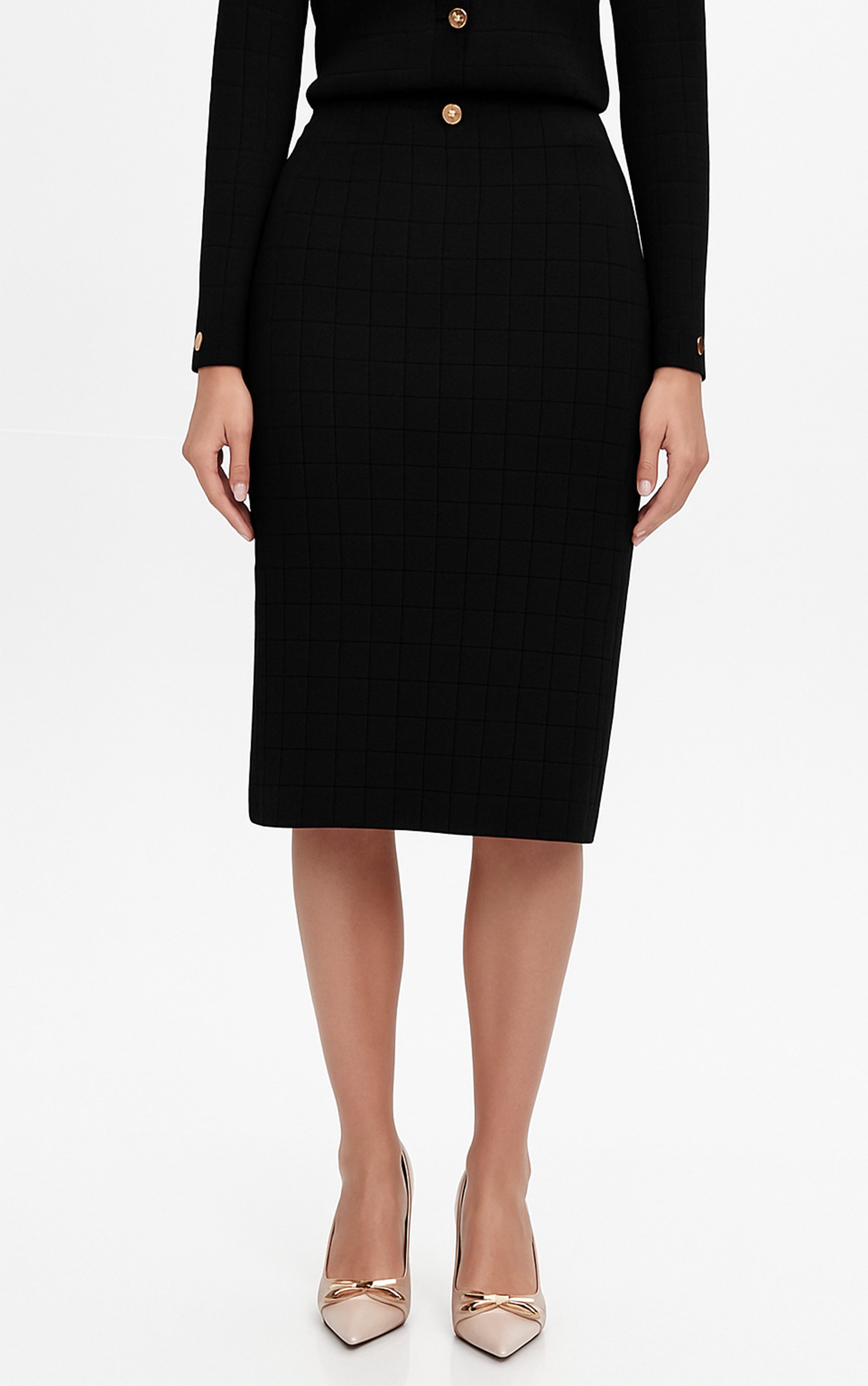 Materialzusammensetzung 75% Viskose, 25% Polyamid Ein moderner Klassiker, der in deinem Kleiderschrank nicht fehlen darf – zeitlos, vielseitig und immer stilvoll! Dieser Passioni Strickrock hat eine knieumspielende Длина und eine figurumspielende, gerade Passform, die deine Silhouette dezent betont. Die Karo-Struktur verleiht ihm eine edle Note, während das elastische Strickmaterial für höchsten Tragekomfort sorgt. Der Stoff liegt angenehm weich auf der Haut und passt sich dank Stretchanteil perfekt deinen Bewegungen an – ideal für den ganzen Tag, ob im Büro oder in der Freizeit. Spezialschonwaschgang/Wollwaschgang bis 30°C oder Handwäsche Nicht bleichen Mit dem passenden Cardigan hast du sofort ein stilvolles Set für jede Gelegenheit! Artikel Nr.: 18068