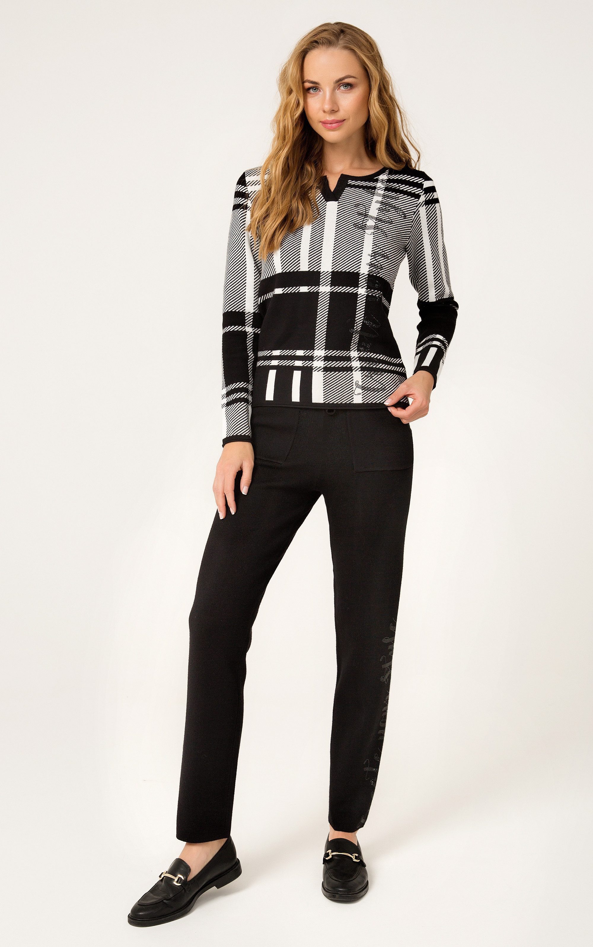Diese schwarze Strickhose von Passioni verbindet Komfort und Eleganz auf stilvolle Weise. Die Hose besticht durch feine Karodetails an der Taille, die dem klassischen Design einen modischen Akzent verleihen. Der feminine Schnitt schmeichelt der Figur und sorgt für eine bequeme und zugleich stilvolle Passform, die sich ideal für den Alltag oder besondere Anlässe eignet. Gefertigt aus hochwertigem, weichem Material, bietet die Hose den ganzen Tag über angenehmen Tragekomfort. In Kombination mit dem passenden Pullover entsteht ein harmonisches und elegantes Ensemble, das vielseitig getragen werden kann. Perfekt für Frauen, die sowohl modische Akzente als auch hohen Komfort schätzen.