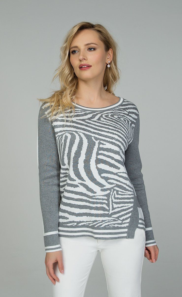 Dieser Pullover besticht durch sein außergewöhnliches, gestricktes Jacquard-Muster im Zebralook. Im Kontrast dazu stehen die grauen Ärmel mit Streifenbesatz. Ein schickes Must-Have für jeden Kleiderschrank.