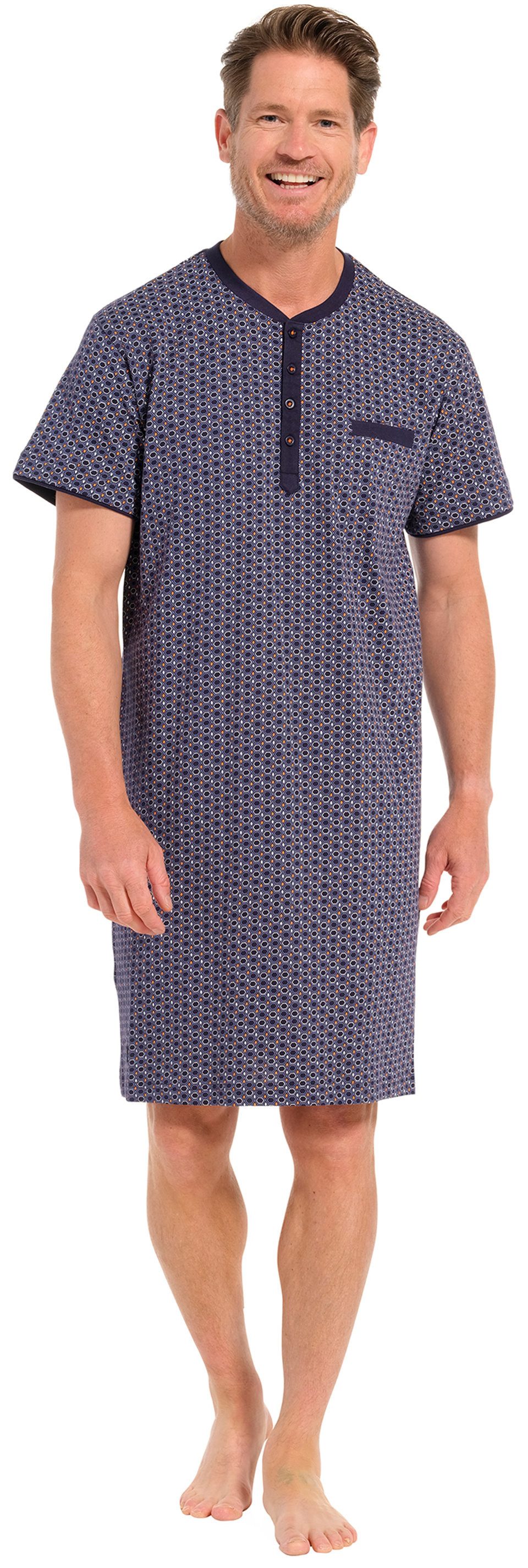Dieses Pastunette Herren Nachthemd ist ein elegantes und bequemes Kleidungsstück, das bis zu einer Длина von 105 cm reicht. Es ist ideal für Männer, die nachts gerne etwas mehr Stoff und Bedeckung haben, aber dennoch den Komfort und die Leichtigkeit von Baumwolle schätzen. Das Nachthemd verfügt über einen klassischen Rundhalsausschnitt, der eine bequeme Passform bietet und den Halsbereich nicht einengt. An der Vorderseite des Nachthemds befindet sich eine praktische Knopfleiste. Das Nachthemd ist mit kurzen Ärmeln ausgestattet, was zusätzliche Bewegungsfreiheit und Atmungsaktivität bietet. Dies macht es besonders geeignet für wärmere Nächte oder für Männer, die es vorziehen, ihre Arme frei zu haben. Das Nachthemd besteht aus hochwertiger Baumwolle, einem weichen und atmungsaktiven Stoff, der für seinen Komfort und seine Strapazierfähigkeit bekannt ist. Baumwolle ermöglicht eine effektive Feuchtigkeitsregulierung und sorgt somit für ein angenehmes Schlafklima. Insgesamt bietet dieses Herren Nachthemd eine perfekte Kombination aus Stil, Komfort und Funktionalität für eine erholsame Nachtruhe.