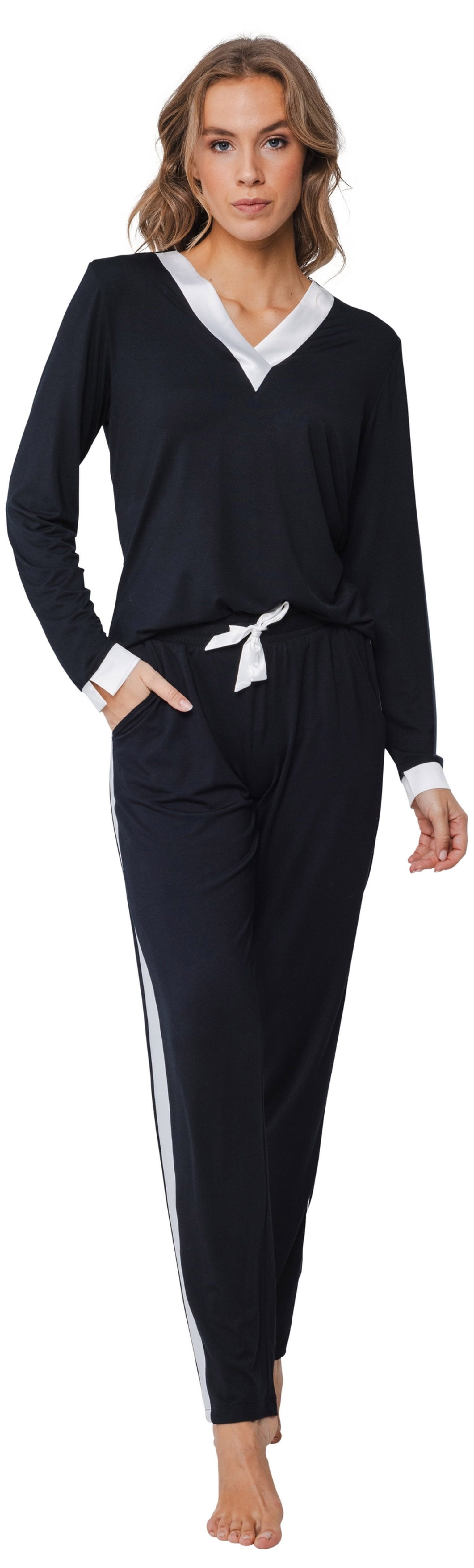 Dieser elegante Pastunette Damen-Schlafanzug vereint Komfort und Stil. Hergestellt aus 95% Modal und 5% Elasthan, bietet er eine wunderbar weiche, glatte Haptik und optimale Dehnbarkeit. Modal, ein besonders atmungsaktives und feuchtigkeitsregulierendes Material, sorgt dafür, dass Sie sich die ganze Nacht über frisch und wohl fühlen. Der Elasthan-Anteil verleiht dem Schlafanzug zusätzlich Elastizität, was eine perfekte Passform und Bewegungsfreiheit gewährleistet. Das Oberteil ist mit einem femininen V-Ausschnitt gestaltet, der elegant und zeitlos wirkt. Die langen Ärmel bieten zusätzlichen Schutz und Wärme, ideal für kühle Nächte. Besonders stilvoll wirken die weißen Kontrastdetails an den Ärmeln und am Ausschnitt, die dem Schlafanzug einen modernen, klaren Look verleihen. Der Rest des Schlafanzugs ist in schwarz gehalten, was einen klassischen und zeitlosen Stil vermittelt. Dieser Schlafanzug kombiniert Funktionalität mit einem stilvollen Design, ideal für Damen, die Komfort und Eleganz in ihrer Nachtwäsche schätzen.
