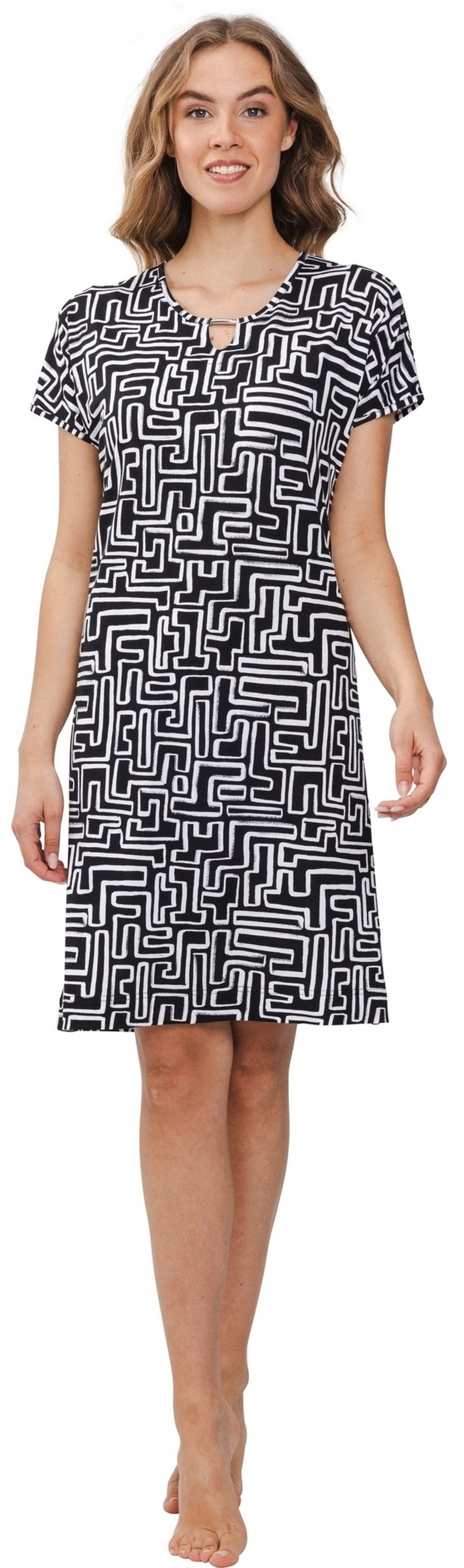 Dieses Pastunette Sommer Damen Kleid kombiniert ein modernes grafisches Muster mit höchstem Tragekomfort und einem stilvollen Design. Gefertigt aus einem hochwertigen Materialmix von 95% Viskose und 5% Elastan, besticht das Kleid durch seine weiche, fließende Haptik und eine optimale Passform. Die Viskose sorgt für ein angenehm leichtes Tragegefühl und eine ausgezeichnete Atmungsaktivität, während der Elastan-Anteil dem Kleid Flexibilität und Bewegungsfreiheit verleiht. Der klassische Rundhalsausschnitt unterstreicht die schlichte Eleganz des Designs und lässt Raum für Accessoires, während die kurzen Ärmel das Kleid besonders vielseitig und ideal für warme Tage machen. Mit einer Длина von 95 cm bietet es eine schmeichelhafte Passform, die bis knapp über das Knie reicht und sowohl bequem als auch stilvoll ist. Das grafische Muster verleiht dem Kleid einen modischen Akzent und macht es zu einem echten Blickfang. Ob für den Alltag, das Büro oder einen entspannten Stadtbummel – dieses Kleid ist die perfekte Wahl für Frauen, die ein harmonisches Zusammenspiel aus Design und Komfort suchen.