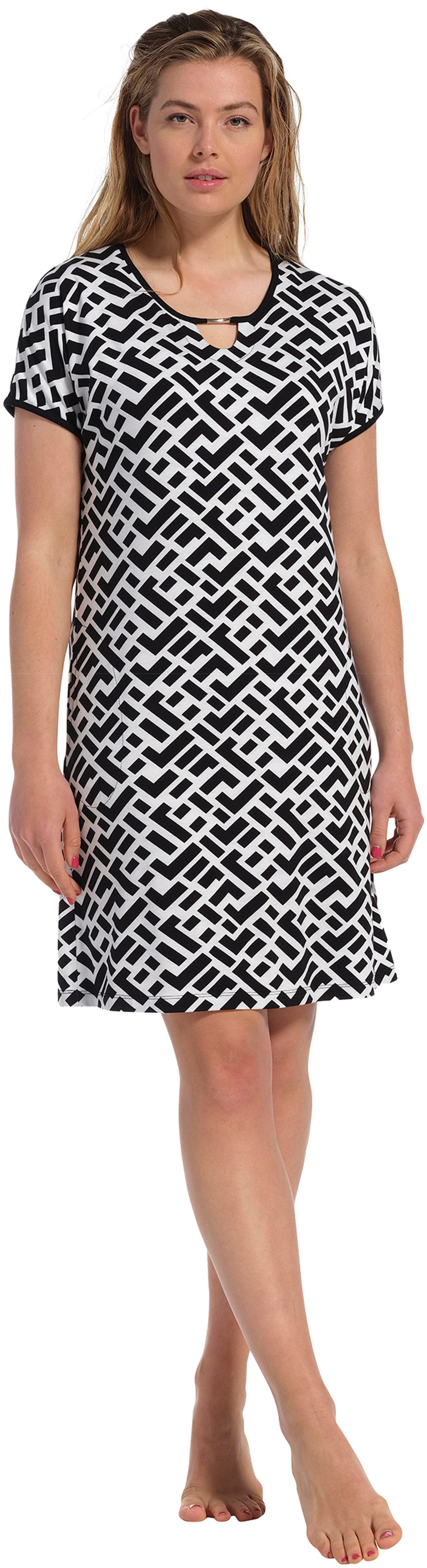 Dieses Pastunette Strandkleid mit kurzem Arm ist eine modische und bequeme Wahl für sonnige Tage am Strand oder am Pool. Mit einem Rundhalsausschnitt und kurzen Ärmeln bietet es eine luftige und lockere Passform, die für maximale Bequemlichkeit sorgt. Hergestellt ist das Kleid aus einem angenehmen Materialmix von 95% Viskose und 5% Elastan. Die Viskose verleiht dem Kleid eine weiche und fließende Textur, während der Elastan Anteil für eine gewisse Dehnbarkeit sorgt, was eine optimale Passform gewährleistet und gleichzeitig die Bewegungsfreiheit unterstützt. Das Strandkleid präsentiert einen grafischen Schwarz-Weiß Print, der für eine moderne und stylishe Optik sorgt. Die harmonische Kombination der Farben verleiht dem Kleid einen zeitlosen Charme, während das grafische Muster einen trendigen Akzent setzt. Mit einer Gesamtlänge von 95 cm bietet das Strandkleid eine optimale Abdeckung und gleichzeitig genügend Bewegungsfreiheit. Dies macht es zu einem vielseitigen Begleiter für entspannte Stunden am Strand oder am Pool. Insgesamt vereint dieses Damen Strandkleid Stil, Komfort und Funktionalität, wodurch es eine ideale Wahl für sommerliche Tage ist.