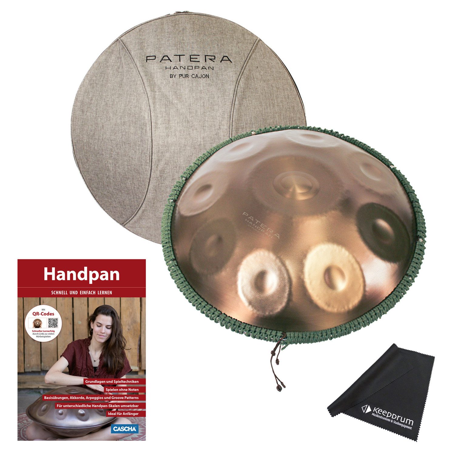 Lieferumfang | Handpan, Tasche, Buch, Tuch |