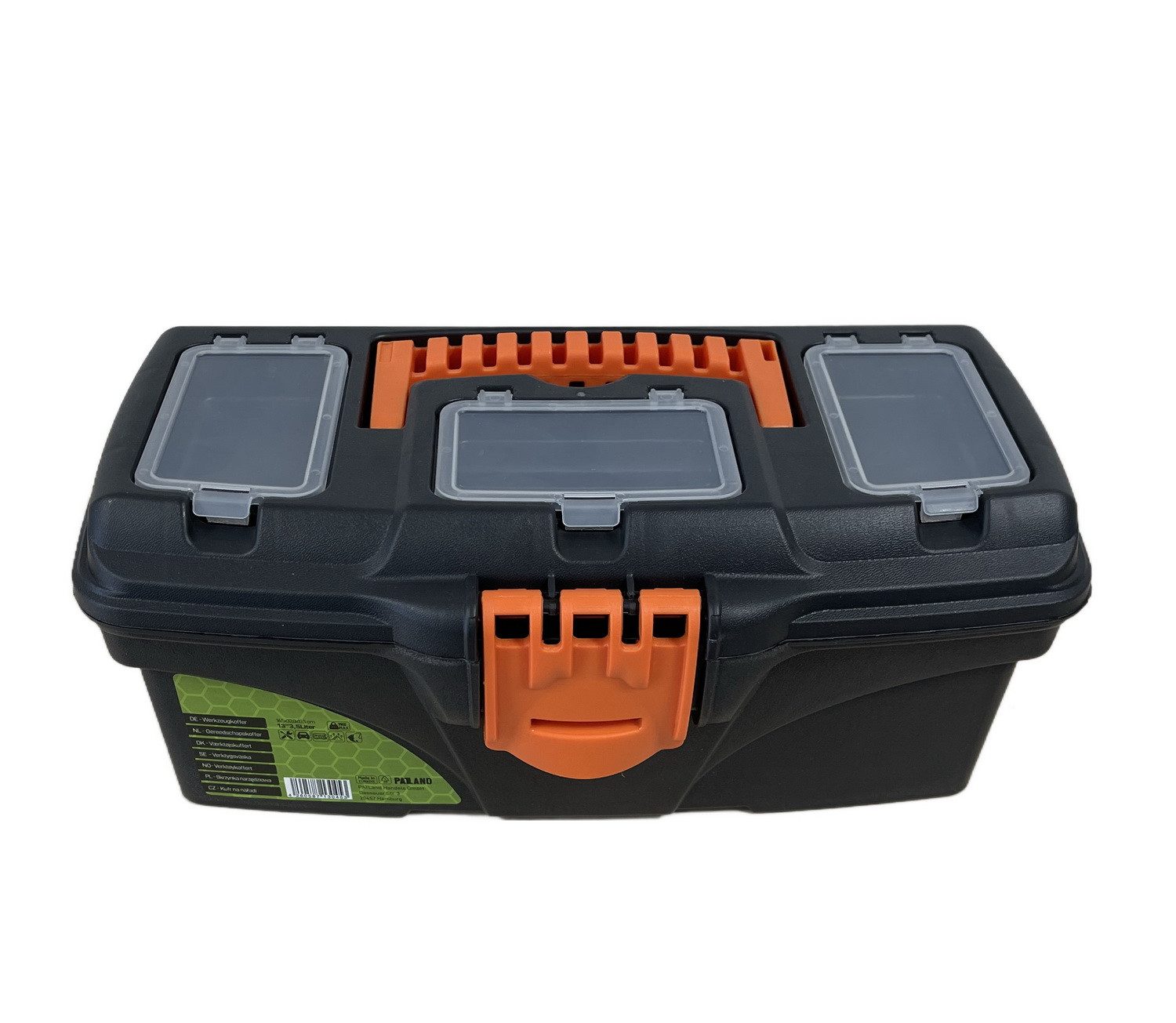 - PATLand Basic Line Werkzeugbox / Werkzeugkiste mit Innenfach - kompakte Werkzeugkiste - herausnehmbare Innenablage - 3 im Deckel integrierte Organizer mit je 2 Fächern - Klemmverschluss für sicheren Verschluss - Griff für sicheren Transport - Material: Kunststoff - Farbe: Schwarz mit orangenem Verschlussclip - Außenmaße(LxBxH): 32 x 15,5 x 13,5 cm - Lieferumfang: 1 Werkzeugkoffer (ohne Werkzeug)