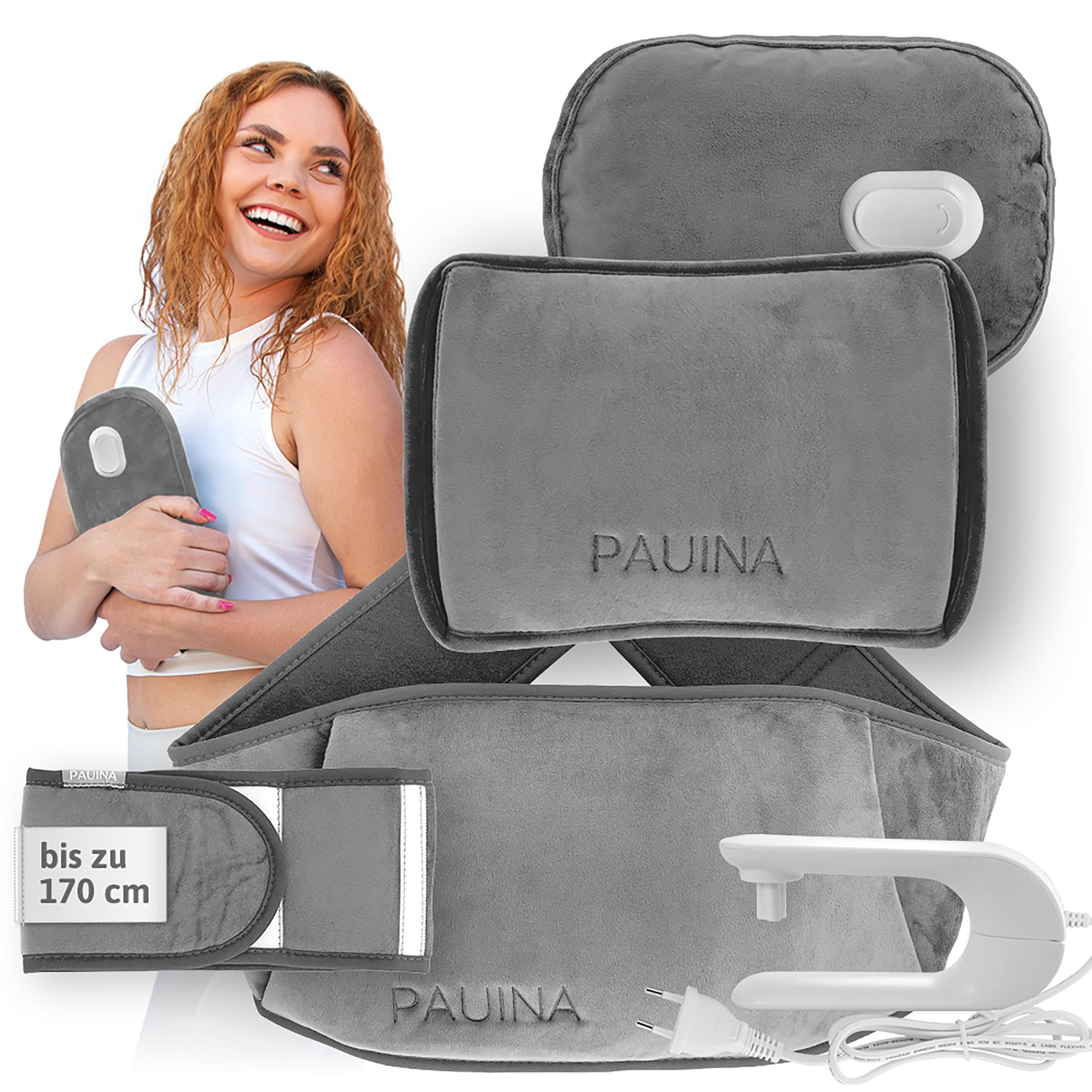 Lieferumfang | Pauina Wärmflasche Ladekabel Gürtel Stoffbezug Gürtelverlängerung |