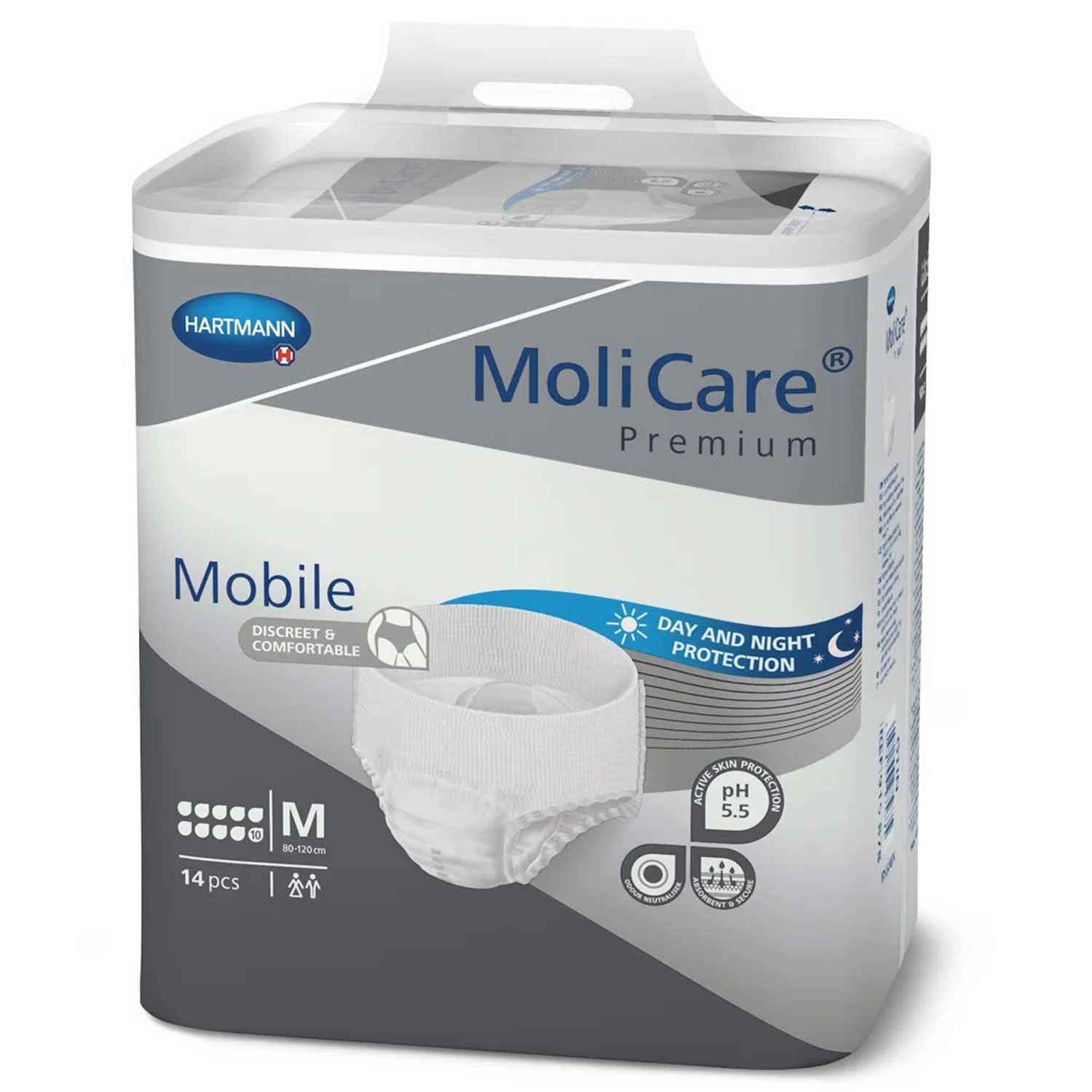 Die MoliCare® Premium Mobile 10 Tropfen in der Размер M ist eine hochsaugfähige Inkontinenzhose, die speziell für Menschen mit schwerer Blasenschwäche entwickelt wurde. In dieser Packung sind 14 Hosen enthalten.