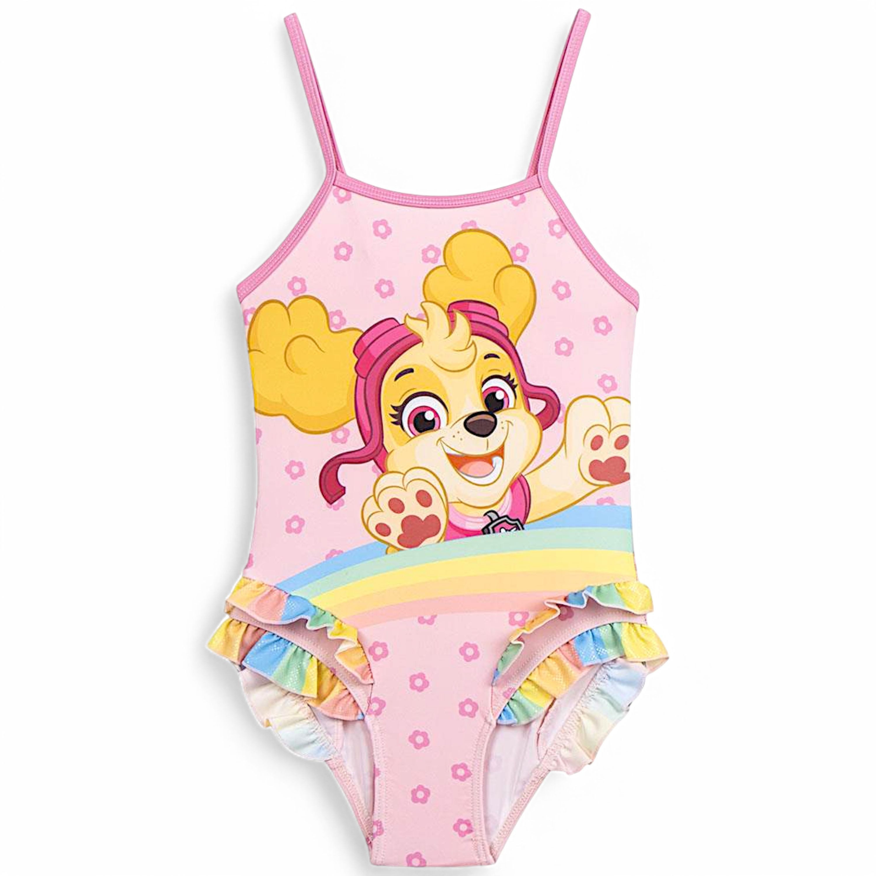 Der farbenfrohe Badeanzug mit Regenbogen-Design und niedlichen Rüschen an der Hüfte sorgt für strahlende Kinderaugen.