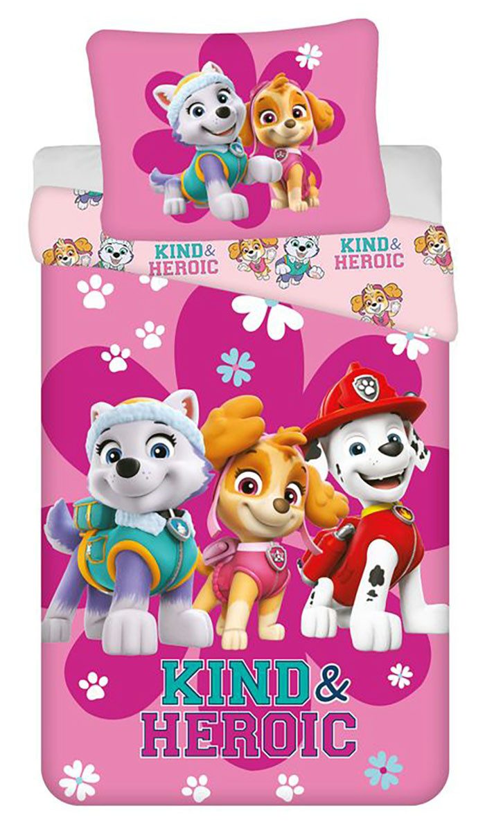 Das Paw Patrol-Team besteht aus sechs mutigen Hunden, die in Adventure Bay den Menschen dabei helfen, ihre Probleme zu lösen. Das berühmte Hundeteam besteht aus Skye, Everest, Rubble, Chase, Zuma und Marshall, die für Ruhe und Ordnung sorgen. Ihr Anführer und bester Freund ist der Junge namens Ryder. Sie bewältigen viele abenteuerliche Missionen und es bleibt auch nicht aus, dass sie mit übernatürlichen Dingen wie z.B. UFO`s in Kontakt treten. Egal aber was auch passieren mag, das Team hält zusammen wie Pech und Schwefel. Aufgrund ihrer weltweiten Bekanntheit zieren die Hunden mittlerweile unzählige Textilwaren, wie auch dieses fantastische Bettwäsche-Set. Kinder werden bei diesem Anblick strahlende Augen bekommen! Das Set besteht aus einem Kopfkissen-Bezug 70 x 90 cm und einem Decken-Bezug 140 x 200 cm. Die kräftigen Farben der Bettwäsche macht sie in jeden Kinderzimmer zum Hingucker. So wird aus einem langweiligen Bett ein Rückzugsort. Das leichte Material von Bettdecke und Kopfkissen ist angenehm kuschelig und weich, so dass die Kids sich wunderbar einkuscheln können. Diese Bettwäsche ist das ideale Geschenk für Ostern, Weihnachten, zum Geburtstag oder einfach zu anderen Anlässen und eignet sich wunderbar für den Urlaub oder für Zuhause. Auf der Bettwäsche sieht man das beliebte Hundeteam Skye, Everest und Marshall bereit für ihre nächste Mission. Die Rückseite des Bettdeckenbezugs ist mit diesen Hunden und der Aufschrift "Kind Heroic" verziert. Auf dem Kissenbezug sieht man die Hunden Skye und Everest, die zu wunderschönen Träumen einladen.