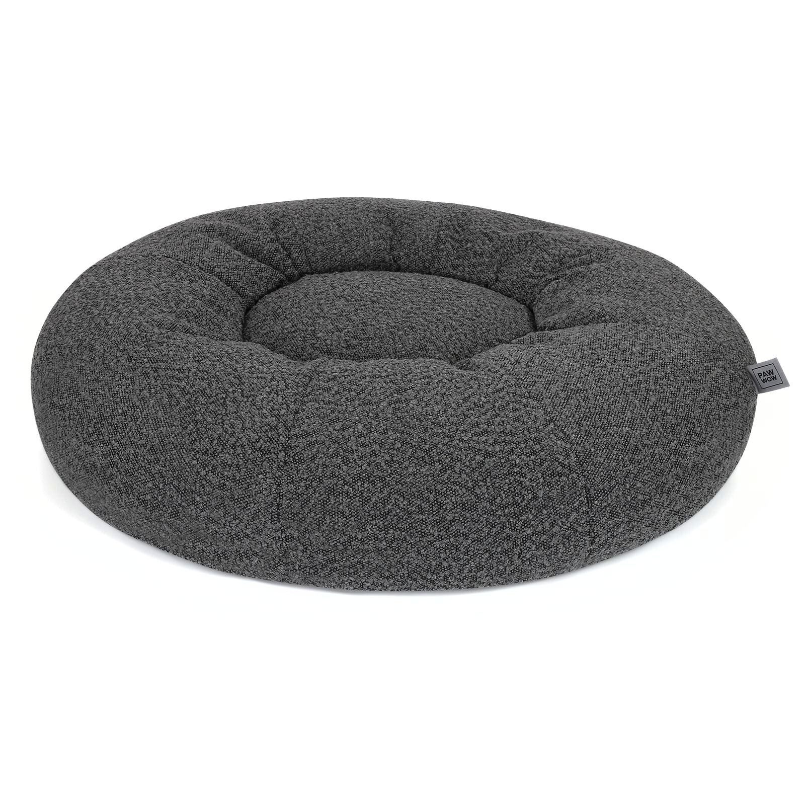 Rundes, gepolstertes Hundebett, umhüllt von luxuriösem Boucle-Stoff – die ideale Kombination aus Stil und Gemütlichkeit.