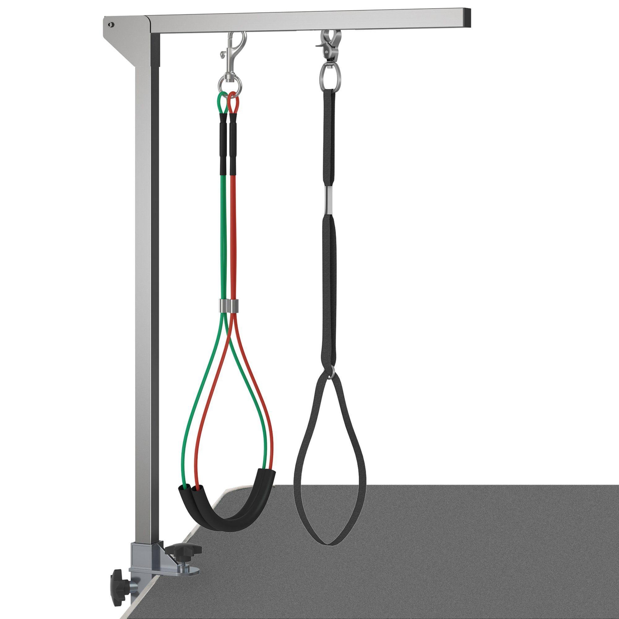 ● Der Edelstahlrahmen ist stabil und langlebig ● Zusammenklappbar für eine einfache Aufbewahrung ● Die höhenverstellbare Stange ist mit Hüftstützen und einer Schließe ausgestattet, sodass sie für Hunde unterschiedlicher Размер geeignet ist ● Das Gestell kann sicher an den meisten Frisiertischen mit einer maximalen Dicke von 2,7 cm befestigt werden ● Geeignet für mittelgroße Hunde mit einem Gewicht von bis zu 20 kg und einer Schulterhöhe von weniger als 50 cm