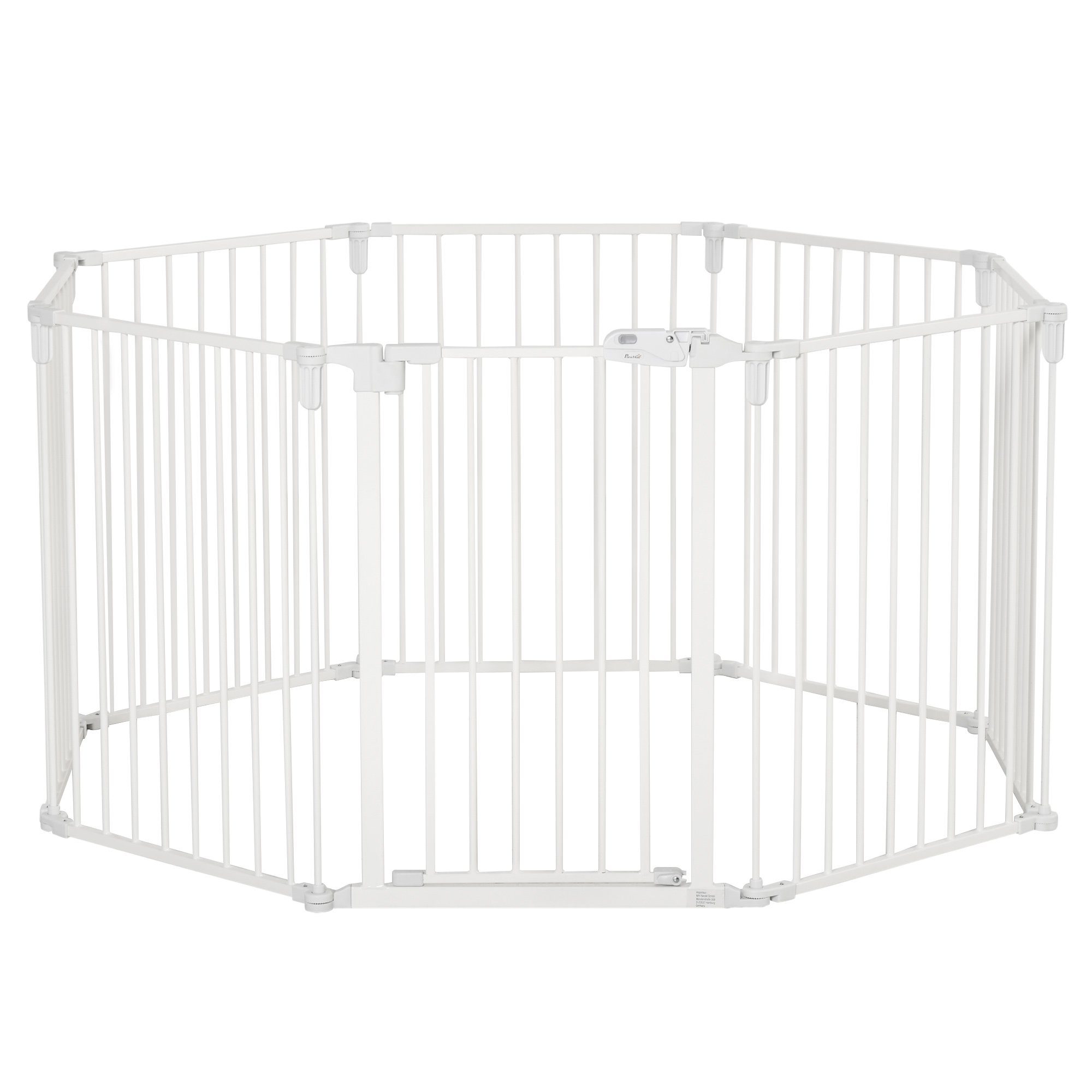 ● Farbe: Weiß ● Material: Stahl, Kunststoff ● Vollständig ausgefahren Größe: 482,5L x 2T x 76H cm ● Zusammenklappbare Größe: 62L x 19,5T x 78H cm ● Einzelteil Größe: 62,5L x 76H cm (mit Tür), 60L x 76H cm (ohne Tür) ● Breite der Eingangstür: 41 cm ● Abstand der Zäune: 5,5 cm