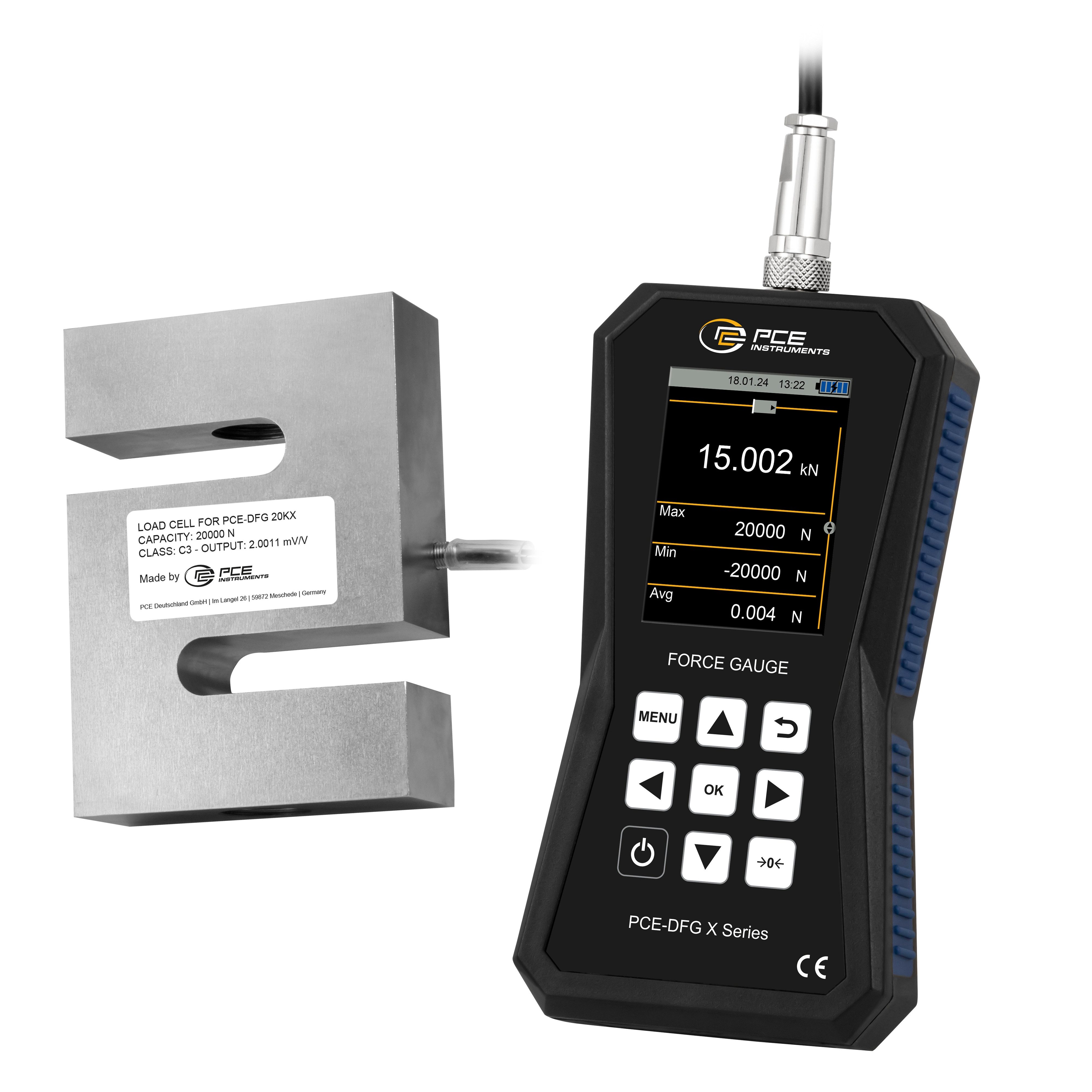 Lieferumfang | 1 x Kraftmessgerät PCE-DFG 20K X1 x Kraftmesszelle PCE-DFG 20K X load cell1 x Koffer1 x USB-C Kabel1 x PC Software1 x Bedienungsanleitung |