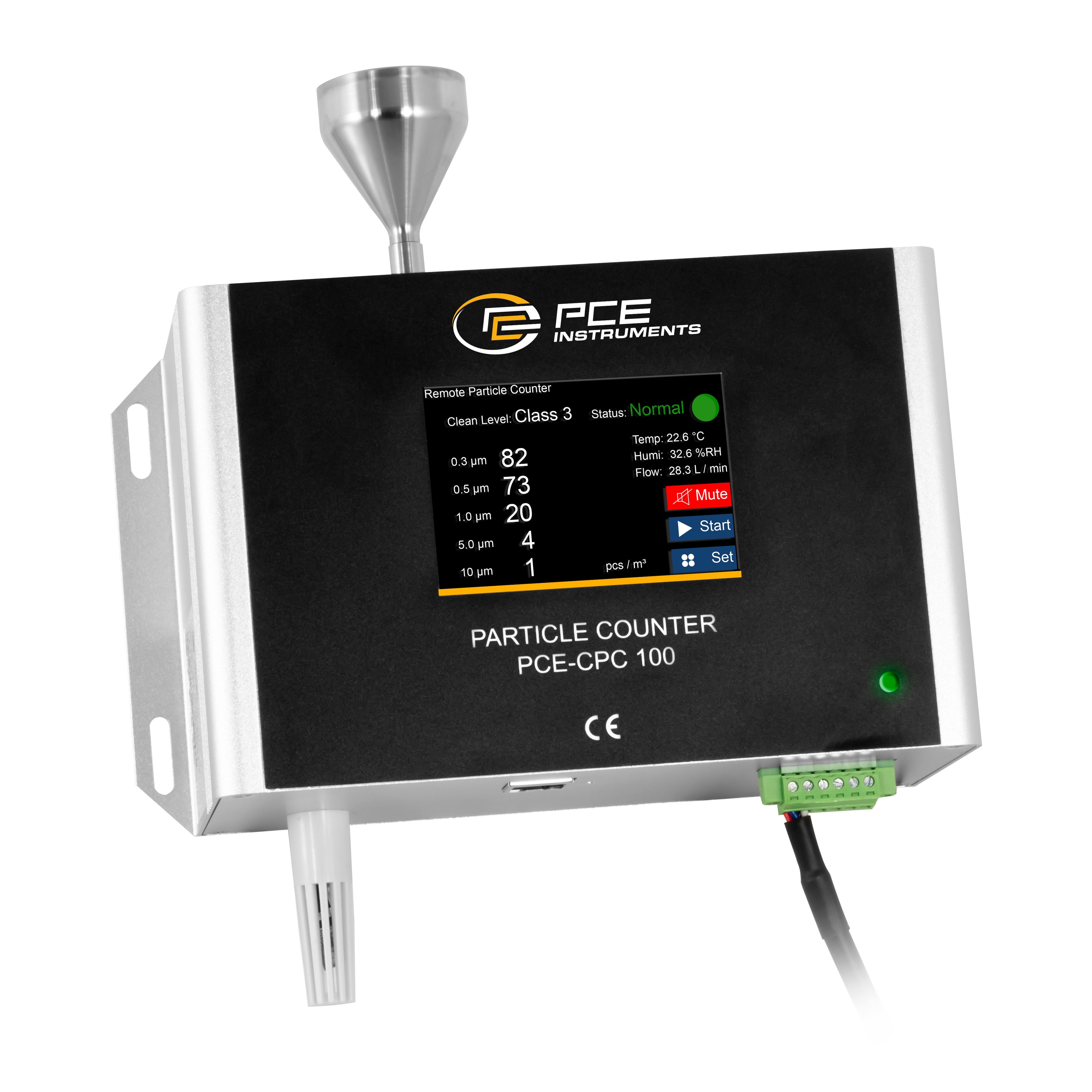 Lieferumfang | 1 x Reinraum-Partikelzähler PCE-CPC 1001 x isokinetische Sonde1 x Schlauch ca. 3 m1 x Netzkabel1 x Netzteil 24 V / 5 A1 x Bedienungsanleitung |