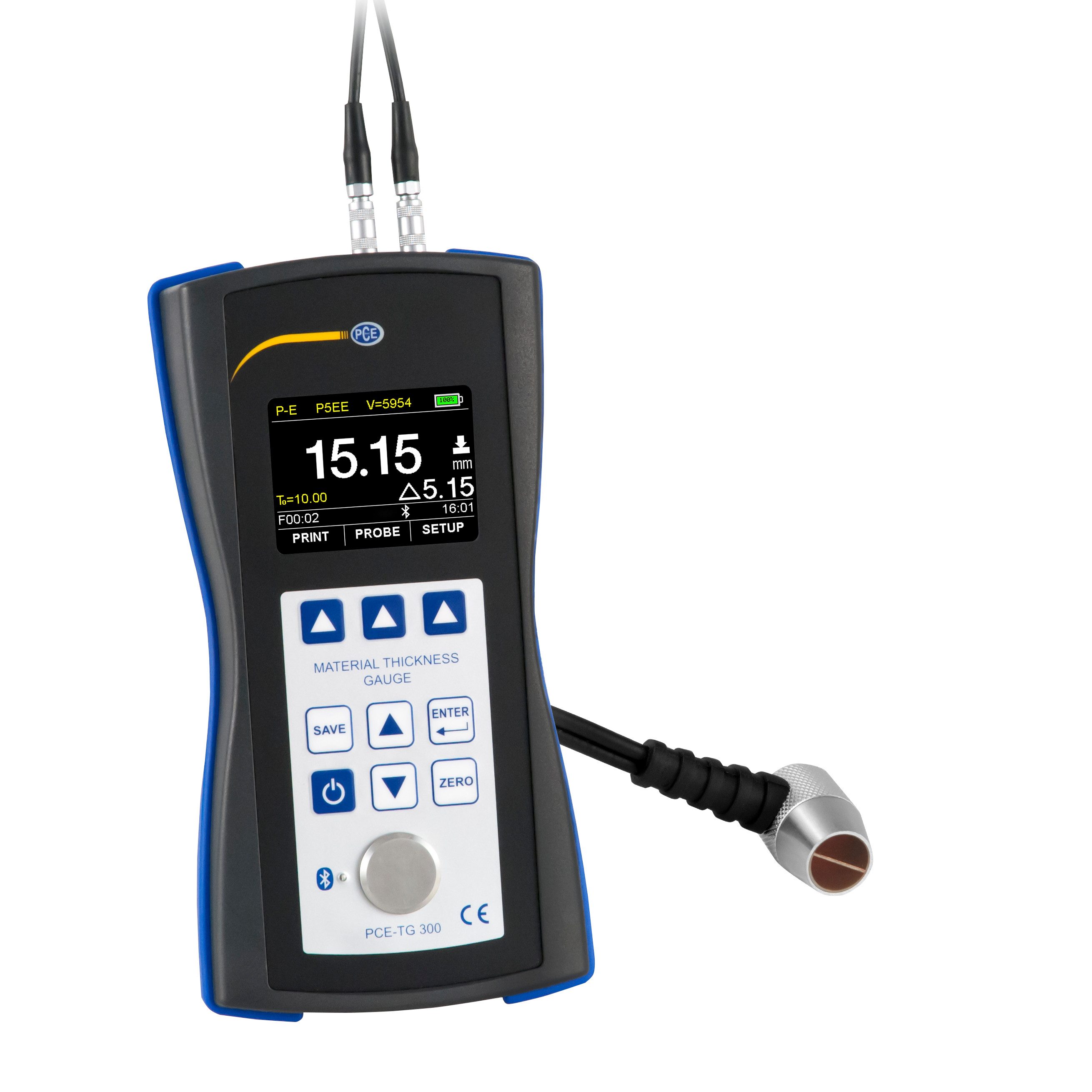 Auf dem gut ablesbaren TFT Farbdisplay werden die Messwerte direkt dargestellt. Durch den internen Speicher, welcher über die optional erhältliche Software ausgelesen werden kann, können unterschiedliche Messstellen eindeutig gespeichert werden. Das zerstörungsfreie Ultraschallmessverfahren ermöglicht die Messung auch an Endprodukten. Durch den Echo-Echo Arbeitsmodus können selbst beschichtete Werkstücke vermessen werden (nur mit Sensor PCE-TG 300-P5EE).