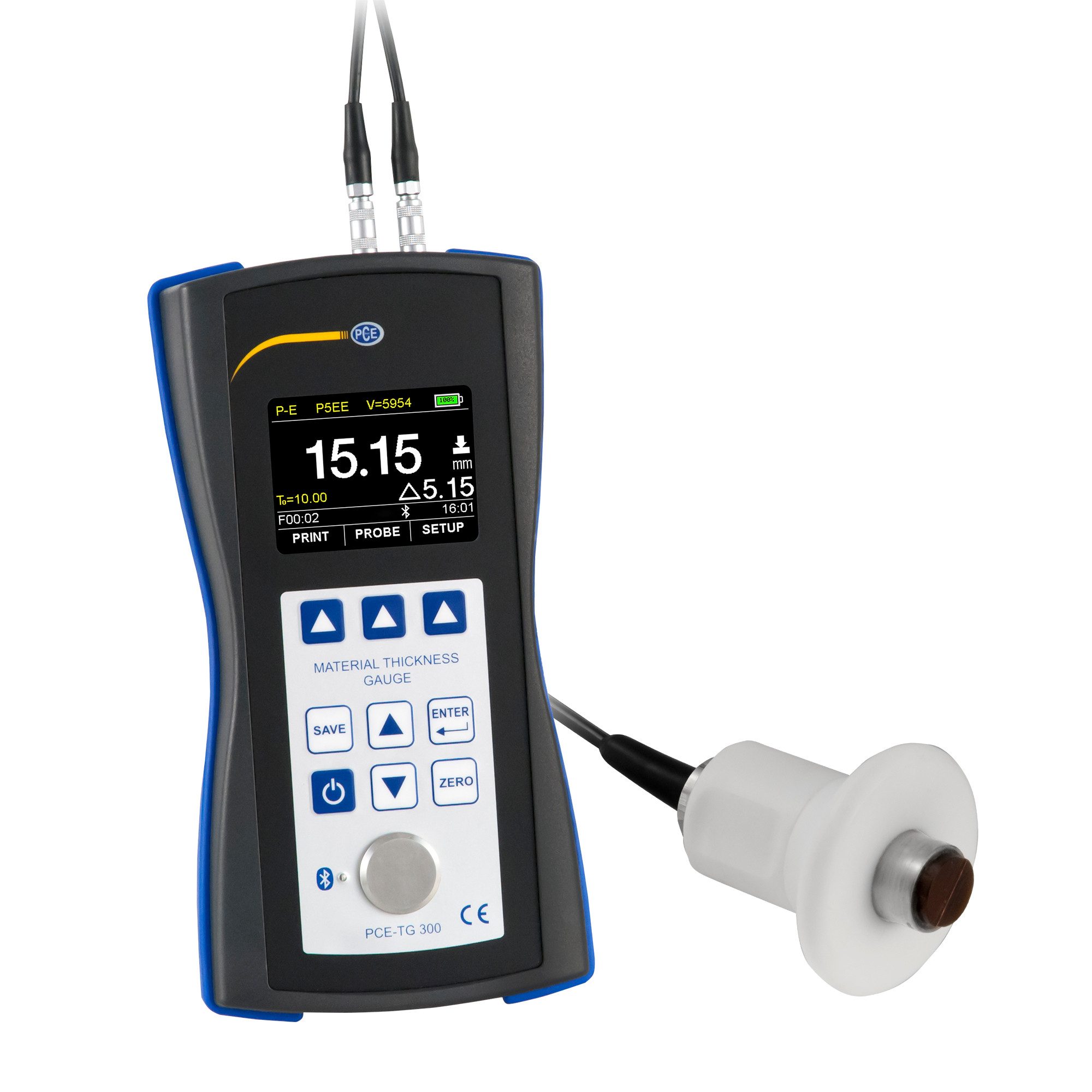 Auf dem gut ablesbaren TFT Farbdisplay werden die Messwerte direkt dargestellt. Durch den internen Speicher, welcher über die optional erhältliche Software ausgelesen werden kann, können unterschiedliche Messstellen eindeutig gespeichert werden. Das zerstörungsfreie Ultraschallmessverfahren ermöglicht die Messung auch an Endprodukten. Durch den Echo-Echo Arbeitsmodus können selbst beschichtete Werkstücke vermessen werden (nur mit Sensor PCE-TG 300-P5EE).