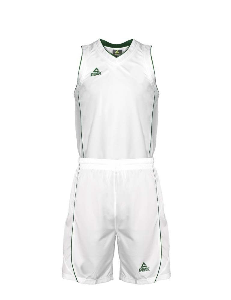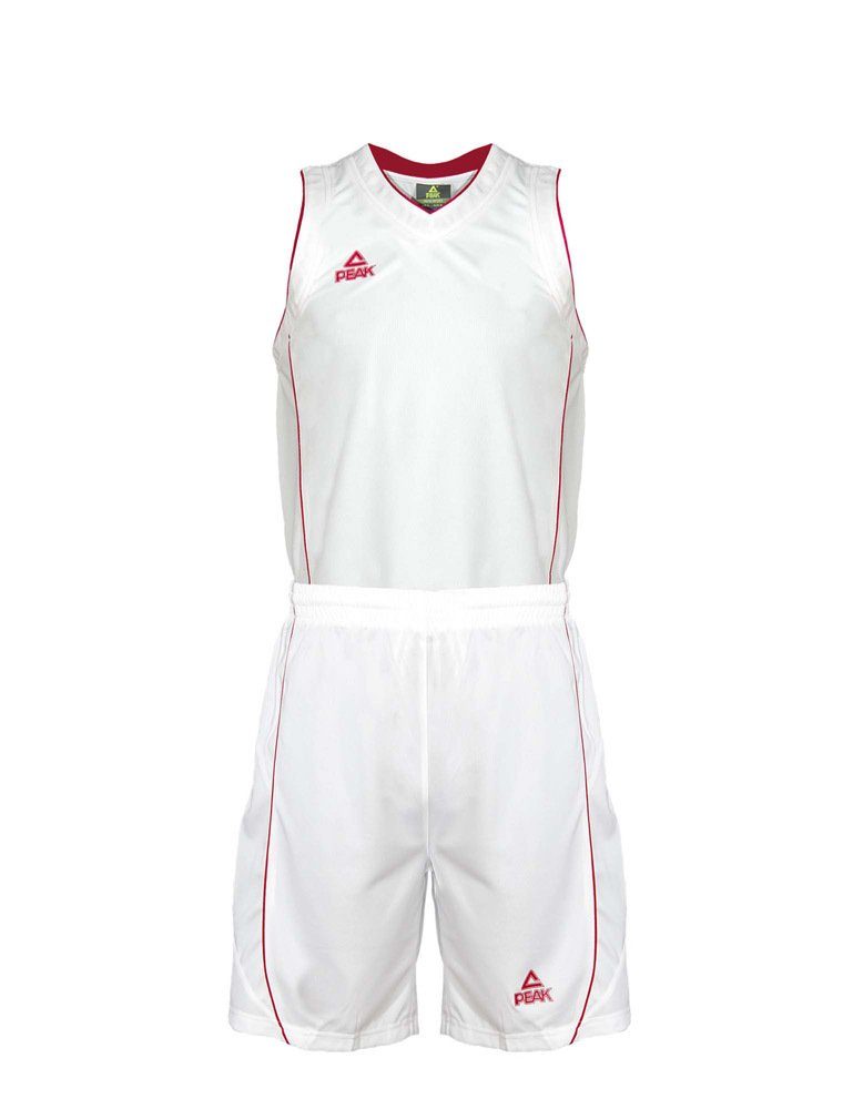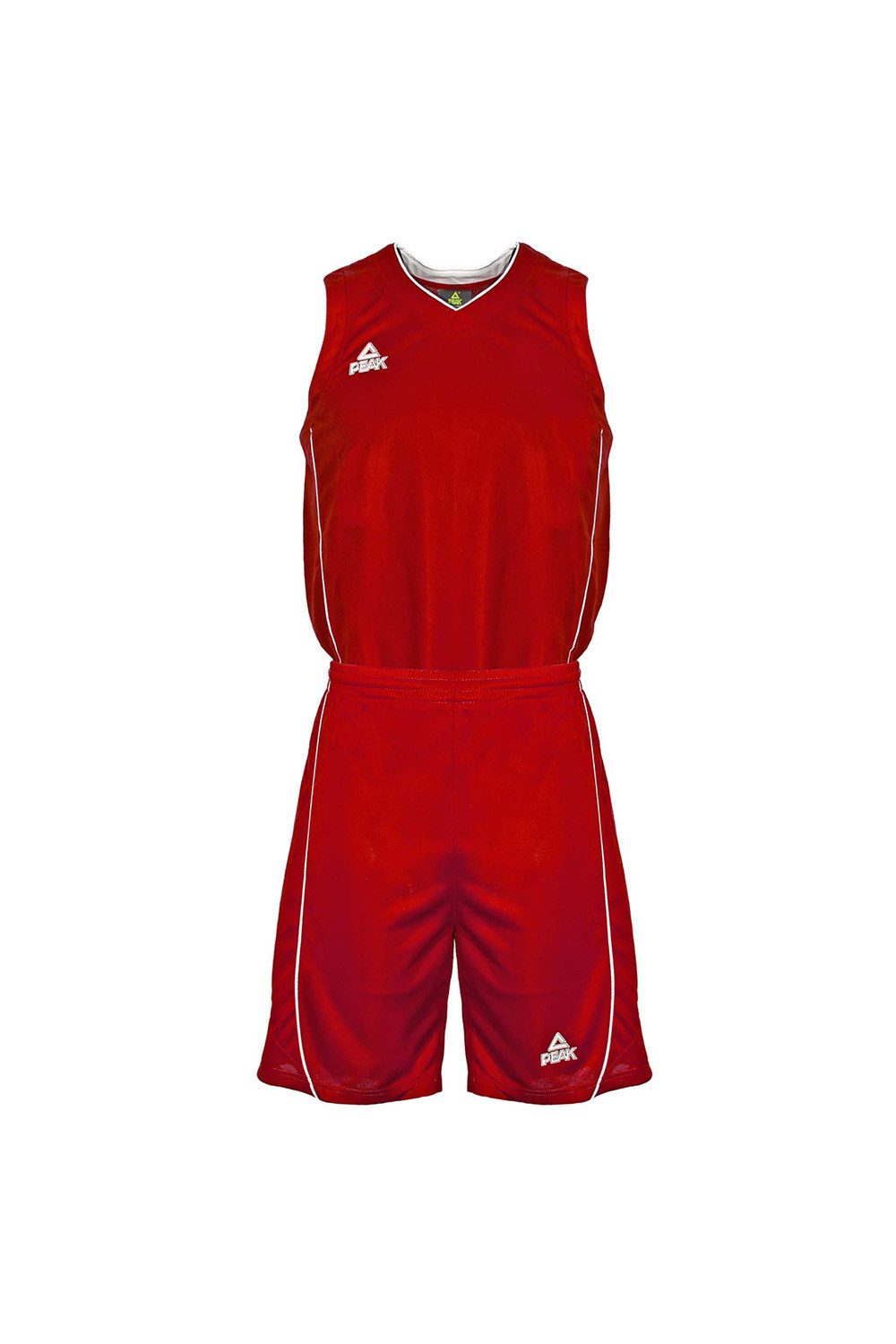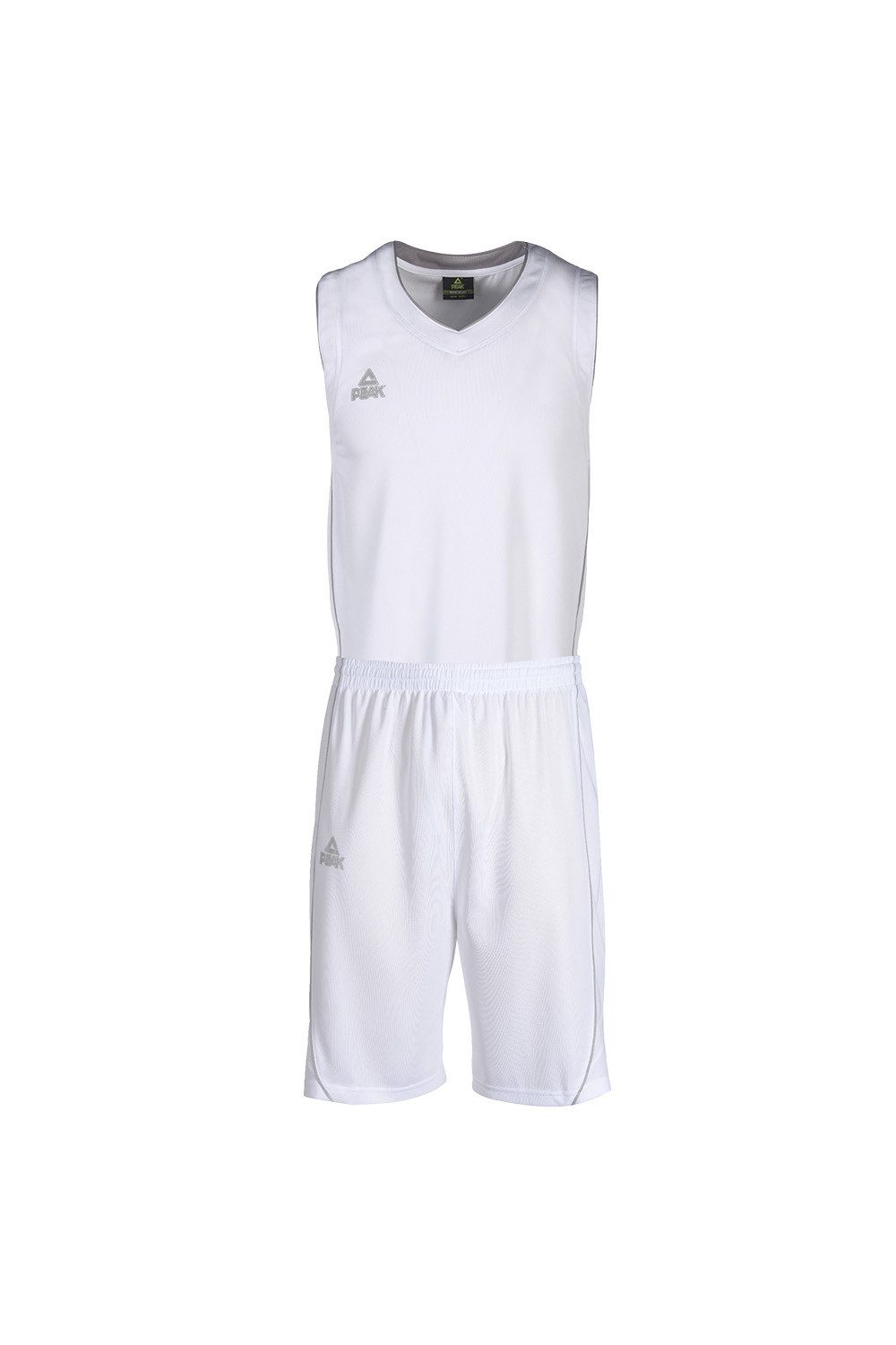 PEAK Sport Europe Herren Trikot Set Team (F771103) Ein angenehm zu tragendes und leichtes Trikotset der TEAM Serie. Dieses leichte Trikotset garantiert durch den schnellen Feuchtigkeitstransport ein stetig trockenes Gefühl während des Sports. Das qualitativ hochwertige Trikot hat farblich abgesetzte Bündchen und Streifen sowie ein kleines, farblich passendes PEAK-Logo im Brustbereich. Die Shorts haben entsprechend weiße, seitliche Streifen und ein kleines PEAK-Logo auf dem linken Bein. Der atmungsaktive Stoff sorgt für ein angenehmes Körperklima. Um den Ansprüchen auf dem Basketballfeld zu entsprechen sind die Trikots extra strapazierfähig.