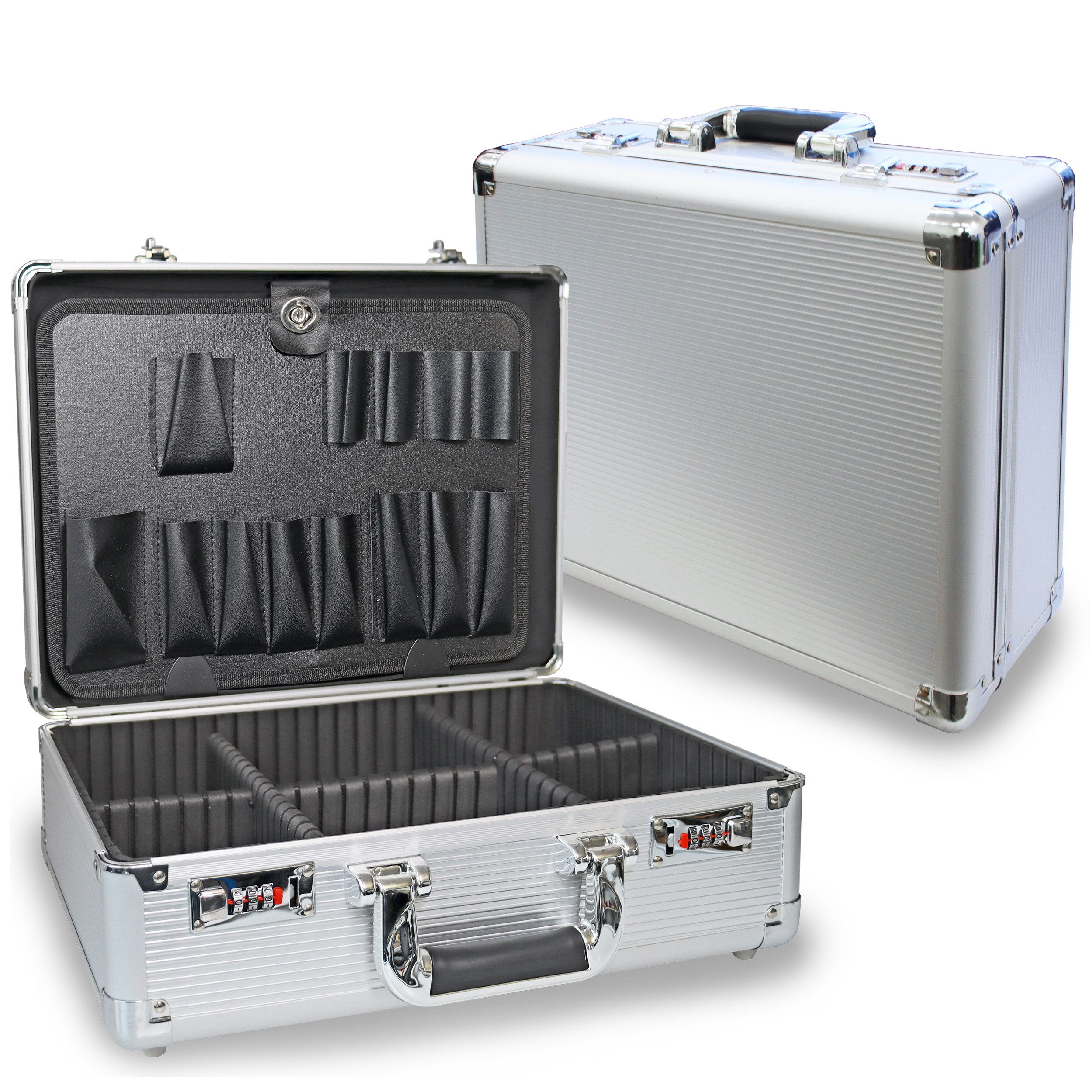 Bei dem PeakTech 7245 handelt es sich um einen praktischen Werkzeugkoffer mit 13 Werkzeughaltern und individuell anpassbaren Fächern. Dieser hochwertige, per Zahlenschloss abschließbare Aluminiumrahmen-Koffer schützt ihr Werkzeug und elektronische Messgeräte auf Reisen oder unterwegs zum Arbeitseinsatz ideal vor allen Beschädigungen. Hinter dem herausnehmbaren Halter für Werkzeug im Kofferdeckel ist Platz für Ordner und Unterlagen im A4 Format, damit auch ihre wichtigen Dokumente sicher transportiert werden können. Neben der stabilen Ausführung mit verstärkten Kanten und abgerundeten Ecken, bietet dieser Koffer vier gummierte Standfüße auf der Unterseite.