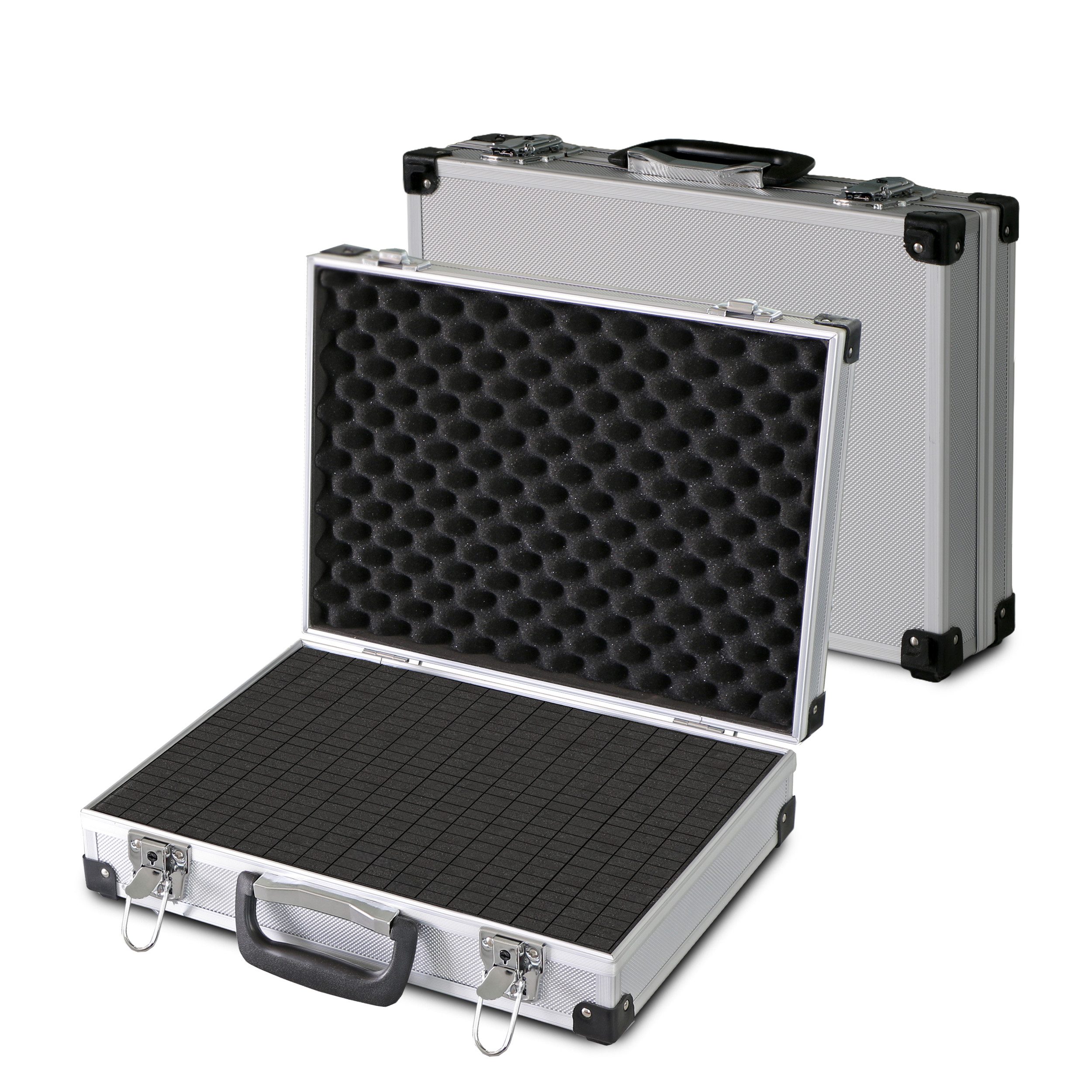 Dieser hochwertige, abschließbare Aluminiumrahmen-Koffer schützt ihre elektronischen Messgeräte auf Reisen oder unterwegs zum Arbeitseinsatz ideal vor allen Beschädigungen. Die Doppelnut in der Schließkante verhindert das Eindringen von Staub und Spritzwasser, während der ausgepolsterte Innenraum die Geräte vor Sturzschäden bewahrt.