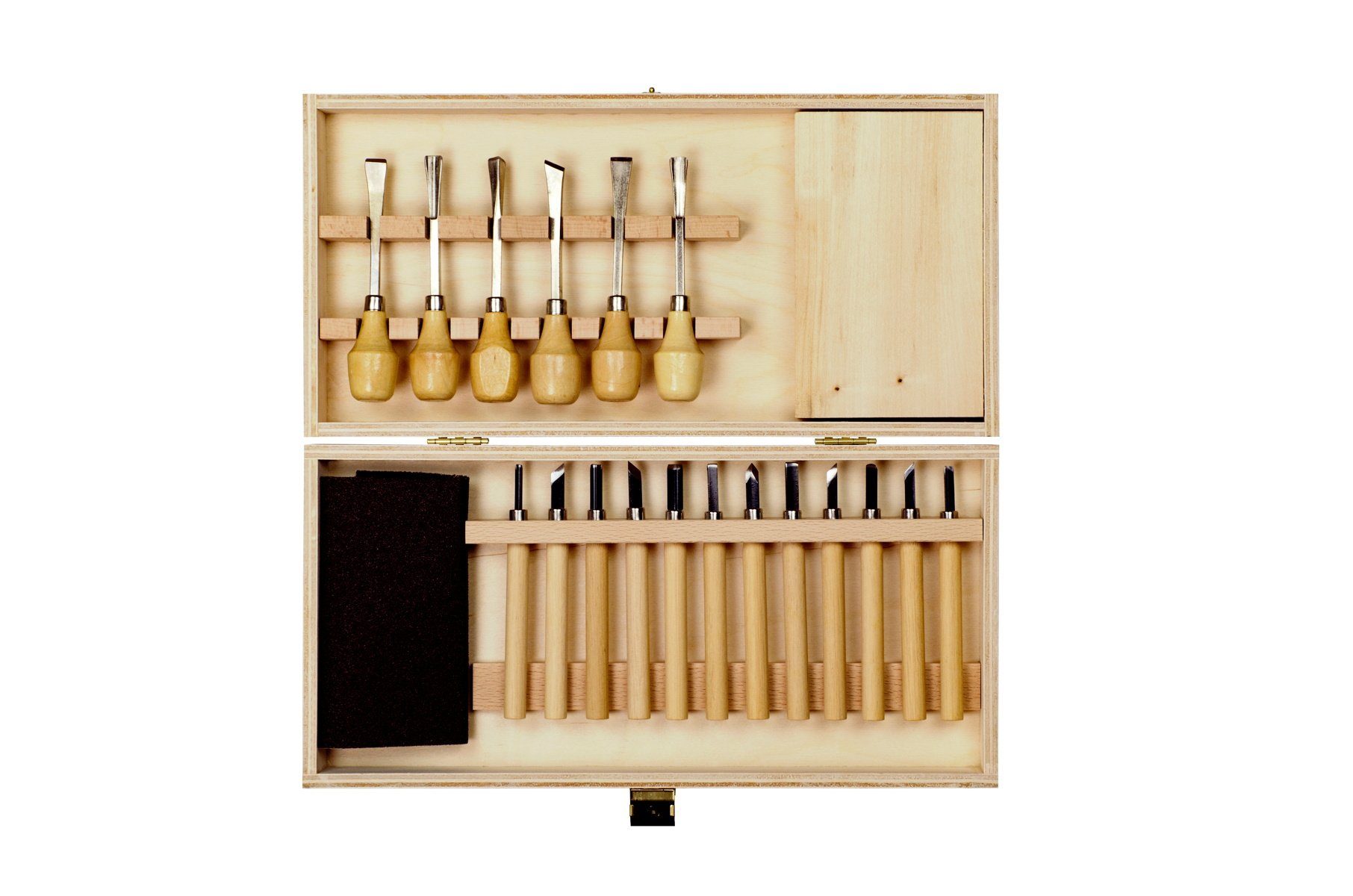 6 Schnitzbeitel,12 Schnitzmesser, Schmirgelpapier, 1 Lindenholzblock (ca. 10 x 16 x 2,5 cm), Aufbewahrungsbox aus Holz (36 x 18 x 6 cmAltersempfehlung | Es liegt keine Altersempfehlung vor |
