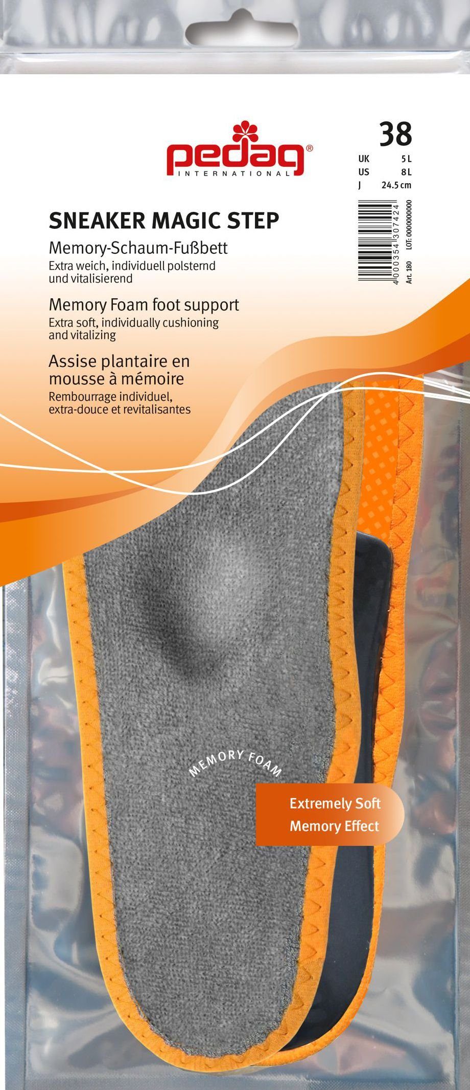 Die „Fingerprobe“ zeigt: Drücken Sie den Memory-Schaum nieder, bleibt die Mulde kurz bestehen, bevor sich das Polster langsam wieder aufrichtet. Der Fuß erhält dadurch eine besonders angenehme und sanfte Bettung.