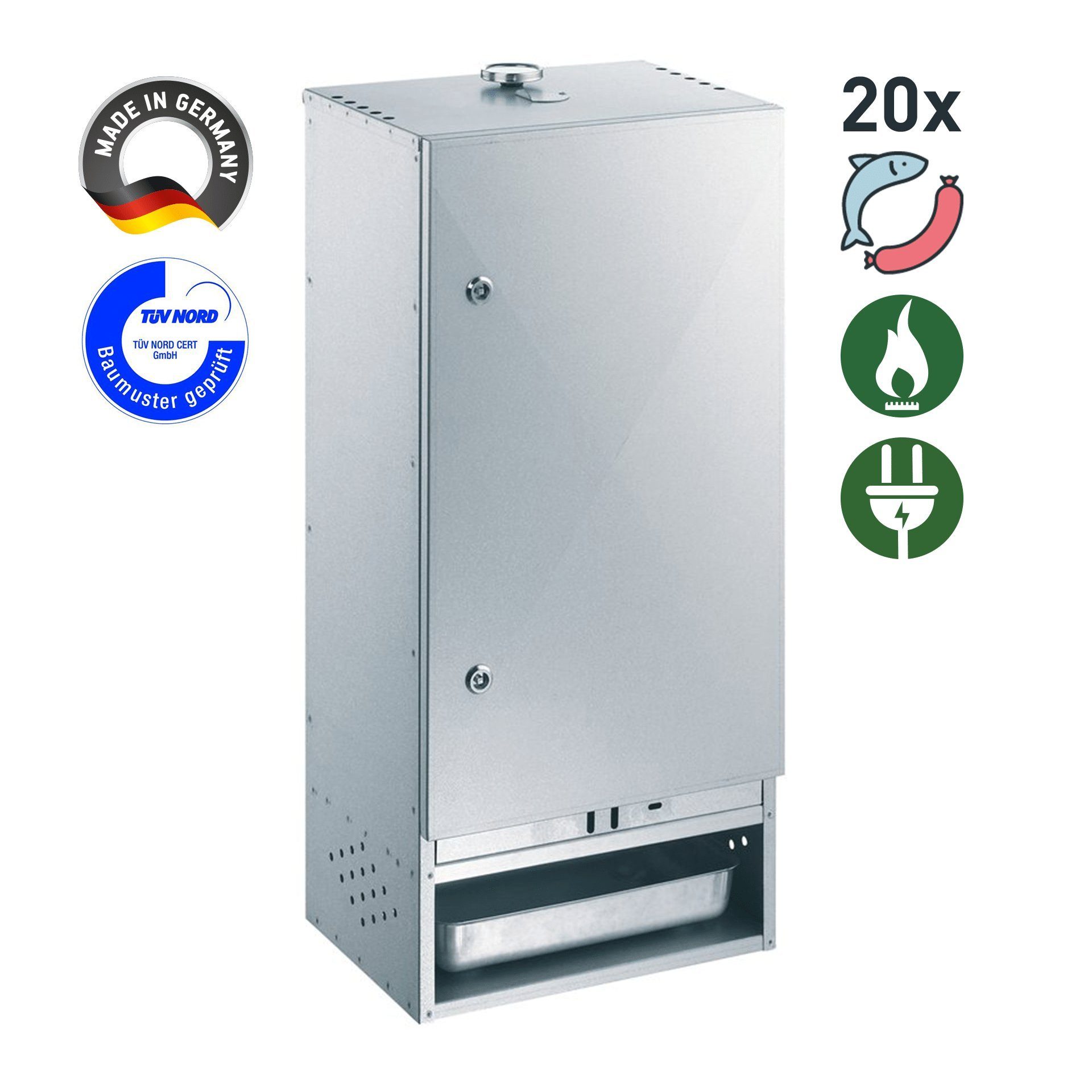 Produktinformationen "Räucherofen mit Tür 630015 aluminiertes Stahlblech für bis zu 20 Fische liegend oder hängend" geeignet zum Heiß- und Kalträuchern von Fisch, Fleisch, Geflügel uvm. Seitenwände sind doppelwandig Ausführung: aluminiertes Stahlblech mit Tür Grundausstattung (im Räucherofen enthalten): 1 Tropfwanne 1 Räuchermehl-Schale 1 Thermometer 1 Rost mit 4 Stäben zum Senkrechträuchern (Aufhängevorrichtung für Räucherhaken) 1 Beutel Räuchermehl (500g) 1 Vierkantschlüssel 1 Räucheranleitung