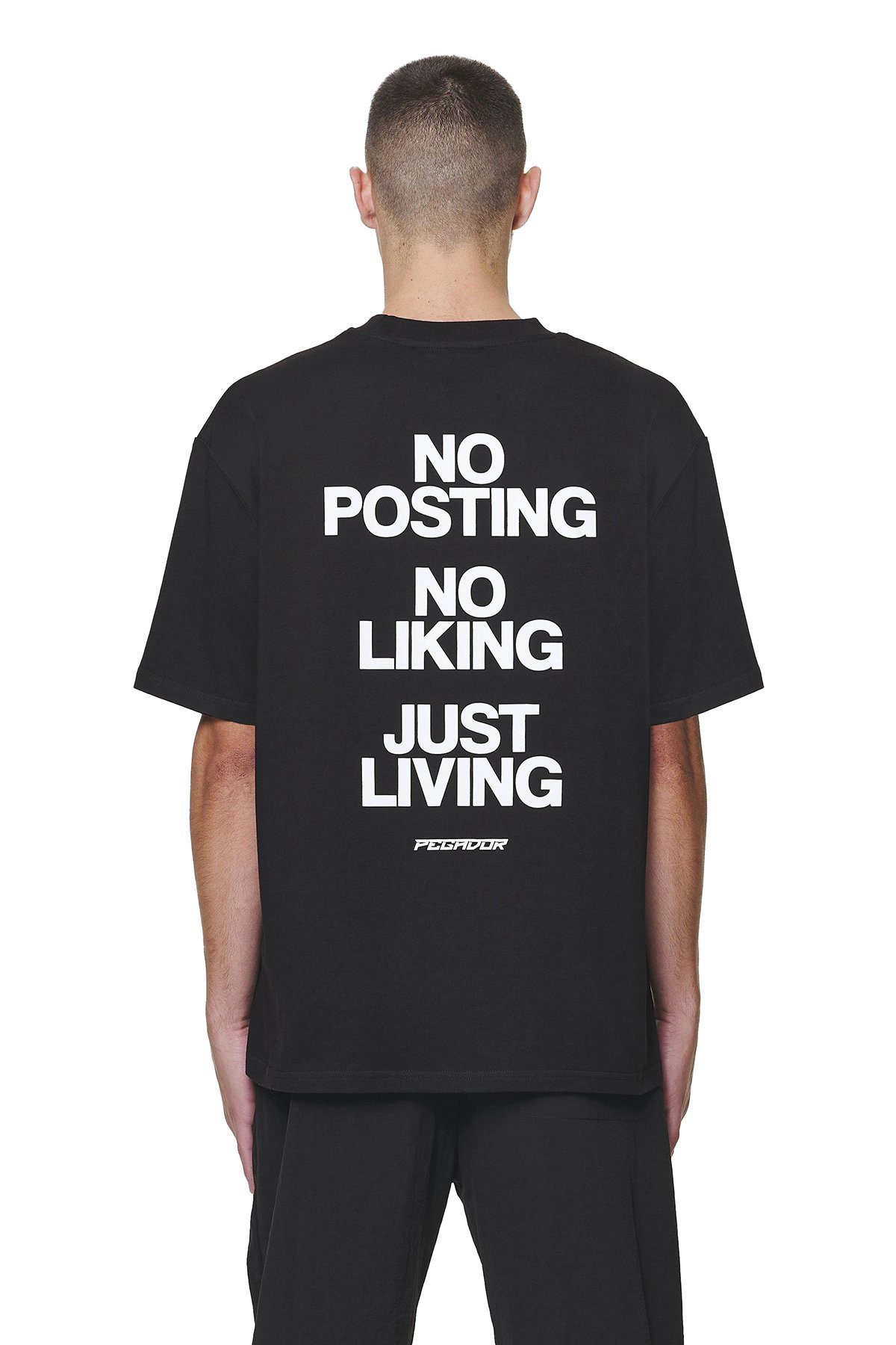 Die Vorderseite des T-Shirts ziert ein kleines, weißes Pegador-Logo, das dem schwarzen Hintergrund einen markanten Akzent verleiht. Diese subtile Kombination aus Schwarz und Weiß schafft einen zeitlosen Look, der sich mühelos in verschiedene Outfits integrieren lässt.