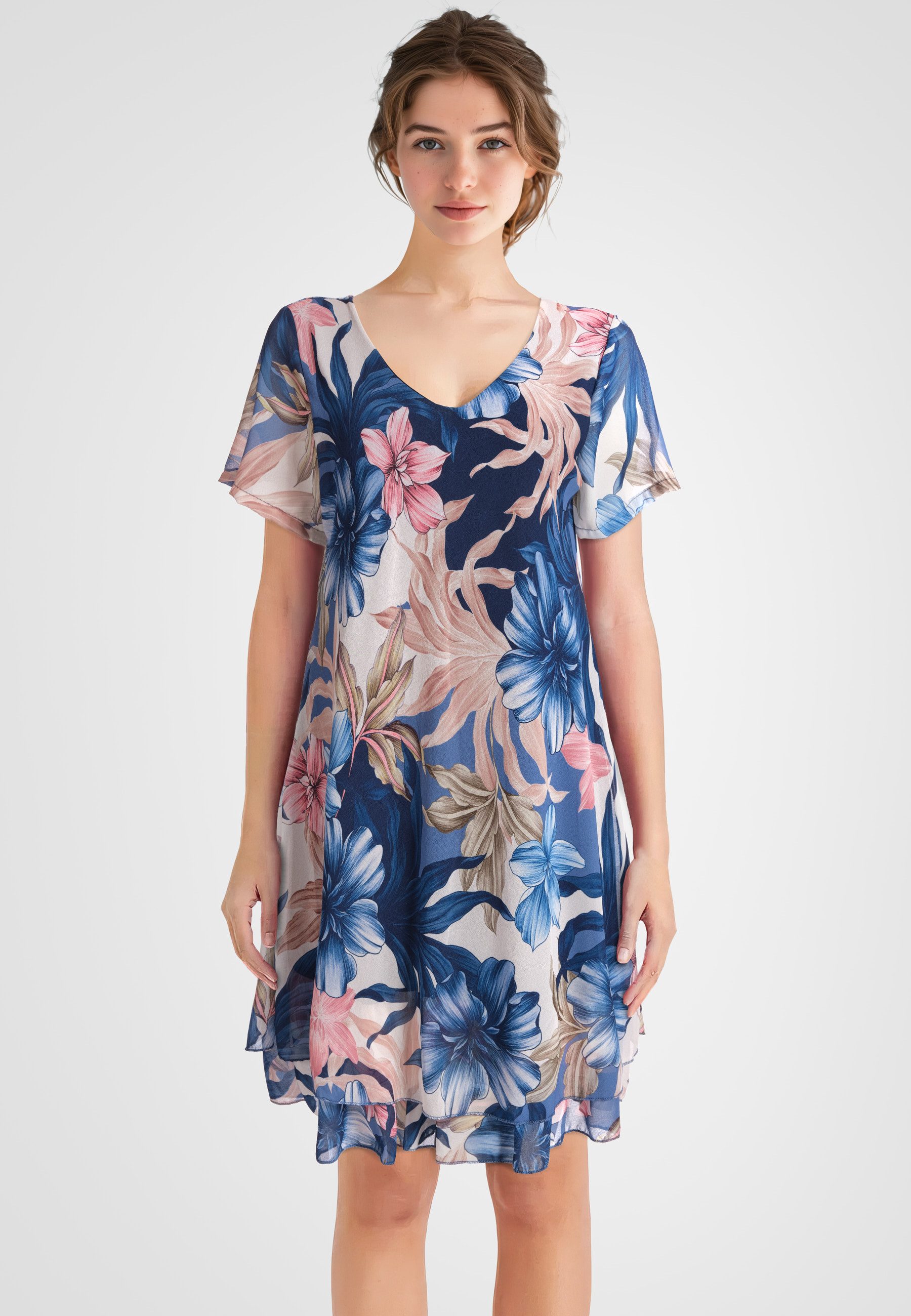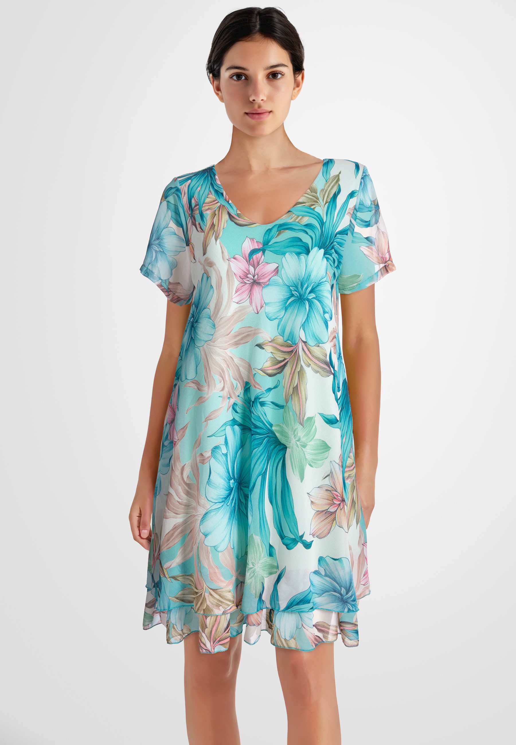 Entdecke das knielange Sommerkleid aus bedrucktem Georgette mit Volants. Italienische Eleganz trifft auf lebendigen Stil. Perfekt für sonnige Tage!
