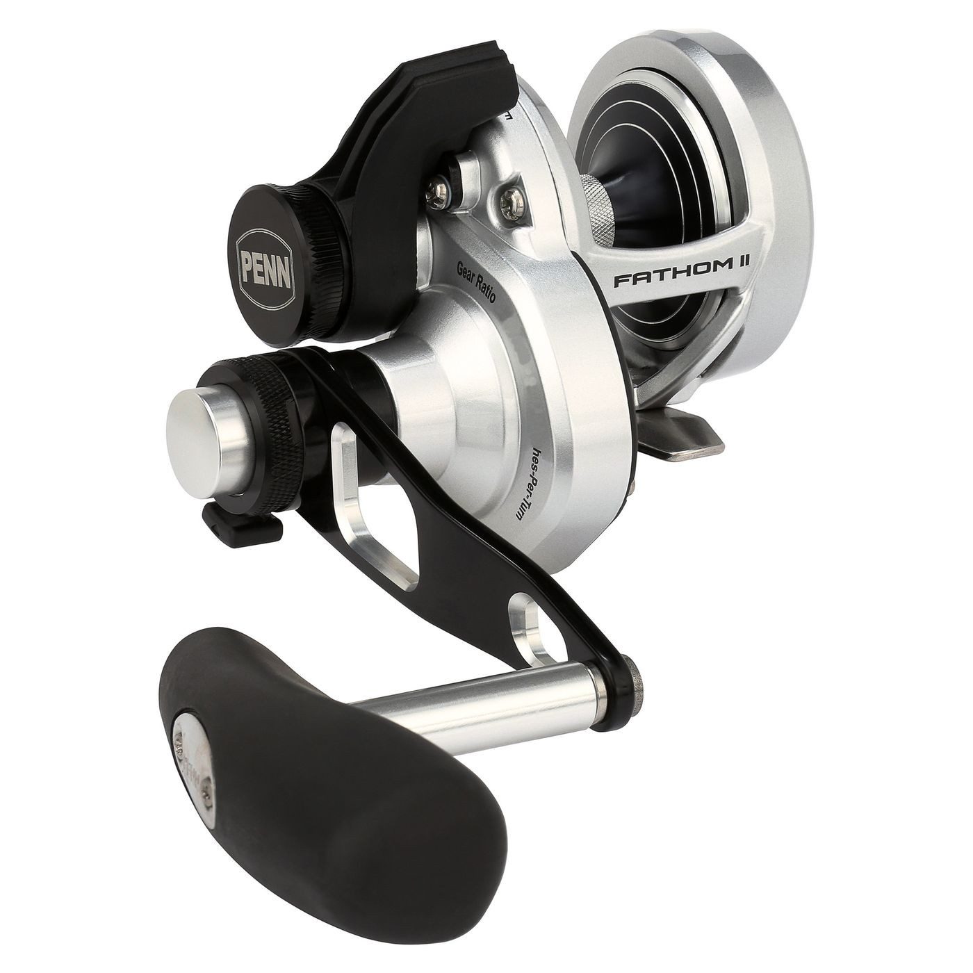 Penn Fathom II 40NLD2 Rolle - Rechtshand Multirolle - Die Angelrolle von Penn ist eine gute Multirolle, die für das Fischen im Salzwasser verwendet werden kann. Durch die Integration der Handflächen-Seitenplatte und des Rahmens liegen die FathomTM II Lever Drag-Rollen kompakter in der Hand und bieten eine hohe Stabilität. Die Pull-to-Turn Voreinstellknöpfe ermöglichen es dem Meeresangler, die Rolle gut einzustellen. Das Herzstück der Salzwasserrolle ist ein Haupt- und Ritzelgetriebe aus Edelstahl und eine geschmiedete und bearbeitete Aluminiumspule.