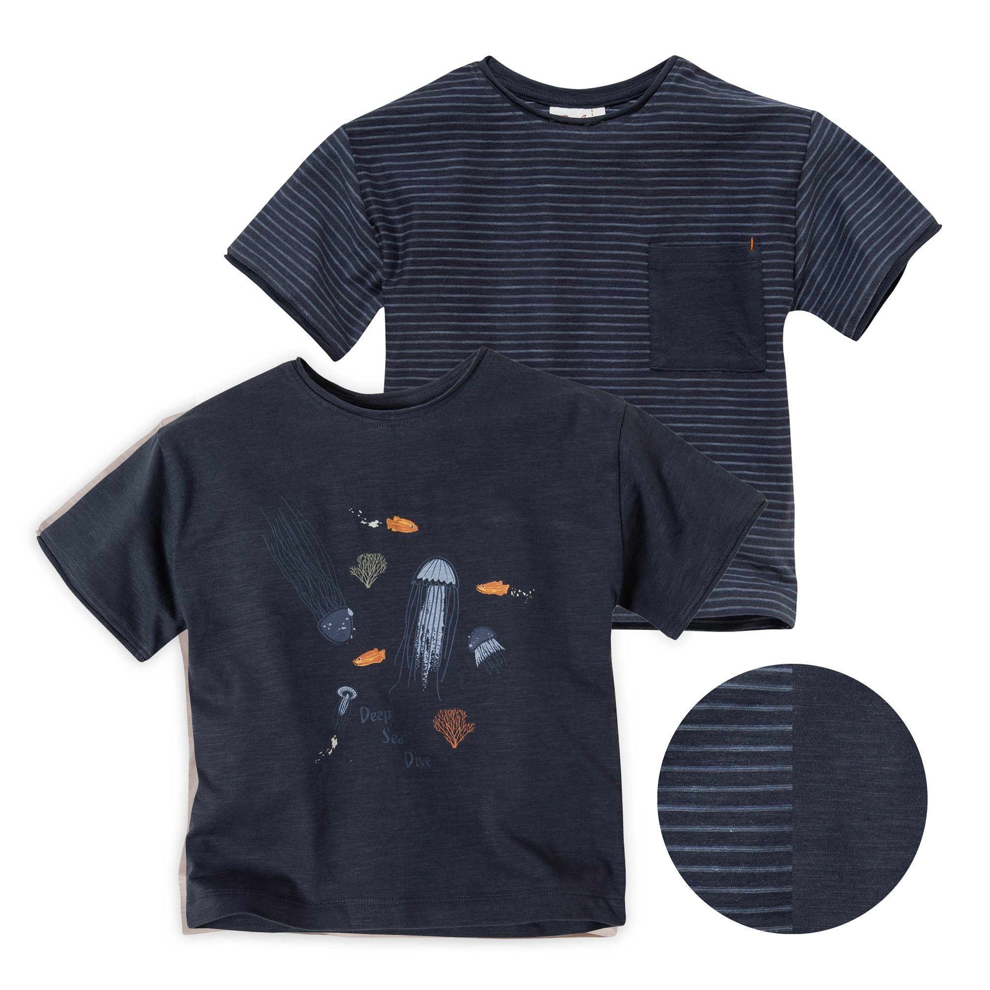 Lieblings-Shirts im Doppelpack. Beide in der Grundfarbe so dunkelblau wie die Tiefsee. Doch vorsicht, man sagt nicht umsonst: wer die Wahl hat, hat die Qual(le). • Kurzarm-Shirt Doppelpack aus Slub Single Jersey aus Bio-Baumwolle • das in diesem besonderen Stoff verarbeitete Slub Garn weist in regelmäßigen Abständen gewollt Verdickungen auf, die schon während seines Spinnprozesses erzeugt werden. Der resultierende Stoff erhält dadurch eine belebte Optik • Shirt 1 dunkelblau geringelt mit aufgesetzter Brusttasche • Shirt 2 dunkelblau mit maritimem Quallenprint • beide mit offenen Rollkanten an Ärmelsaum und Halsausschnitt • beide mit Rückenpasse • bequeme Passform, überschnittene Schultern • 100% Baumwolle aus kontrolliert biologischem Anbau | "organic" gem. GOTS | zertifiziert durch Ecocert Greenlife, Liz. Nr. 151811 • Naturfasern wie Baumwolle laufen beim ersten Waschen etwas ein. Damit du an deinem Textil lange Freude hast, haben wir dies bereits im Schnitt berücksichtigt