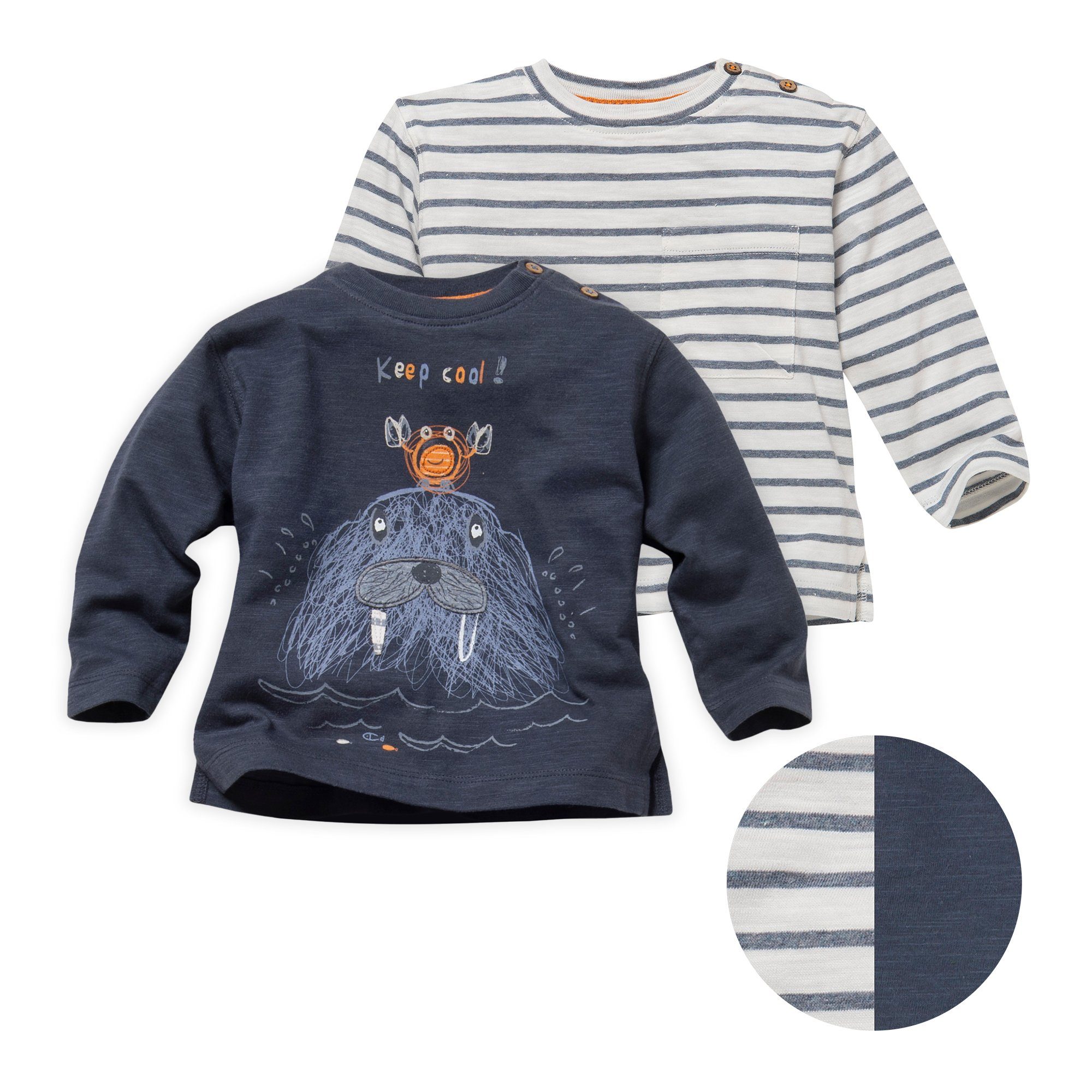 Cool zu bleiben ist manchmal gar nicht so einfach. Cool auszusehen schon! Mit den Langarm-Shirts aus diesem Doppelpack ist es sogar ein Kinderspiel. In diesem Sinne: anziehen, rausgehen, Welt entdecken! • Langarm-Shirt Doppelpack aus kuschelweicher, langlebiger Bio-Baumwolle • maritimes Sommerduo gefertigt aus Slub Single Jersey, das in regelmäßigen Abständen gewollt Verdickungen im verarbeiteten Garn aufweist. Der Stoff erhält dadurch eine belebte Optik • Shirt 1 weiß-blau geringelt mit aufgesetzter Brusttasche • Shirt 2 dunkelblau mit Druck und Applikation Motiv Walross • je zwei kleine Seitenschlitze am Saum • je zwei mit Kontrastgarn angenähte Kokosknöpfe an der linken Schulter für leichtes An- und Ausziehen • Knöpfe aus Schalen der Kokosnuss sind naturbelassen und zu 100 % biologisch abbaubar • normale Passform • 100% Baumwolle aus kontrolliert biologischem Anbau | "organic" gem. GOTS | zertifiziert durch Ecocert Greenlife, Liz. Nr. 151811 • Naturfasern wie Baumwolle laufen beim ersten Waschen etwas ein. Damit du an deinem Textil lange Freude hast, haben wir dies bereits im Schnitt berücksichtigt