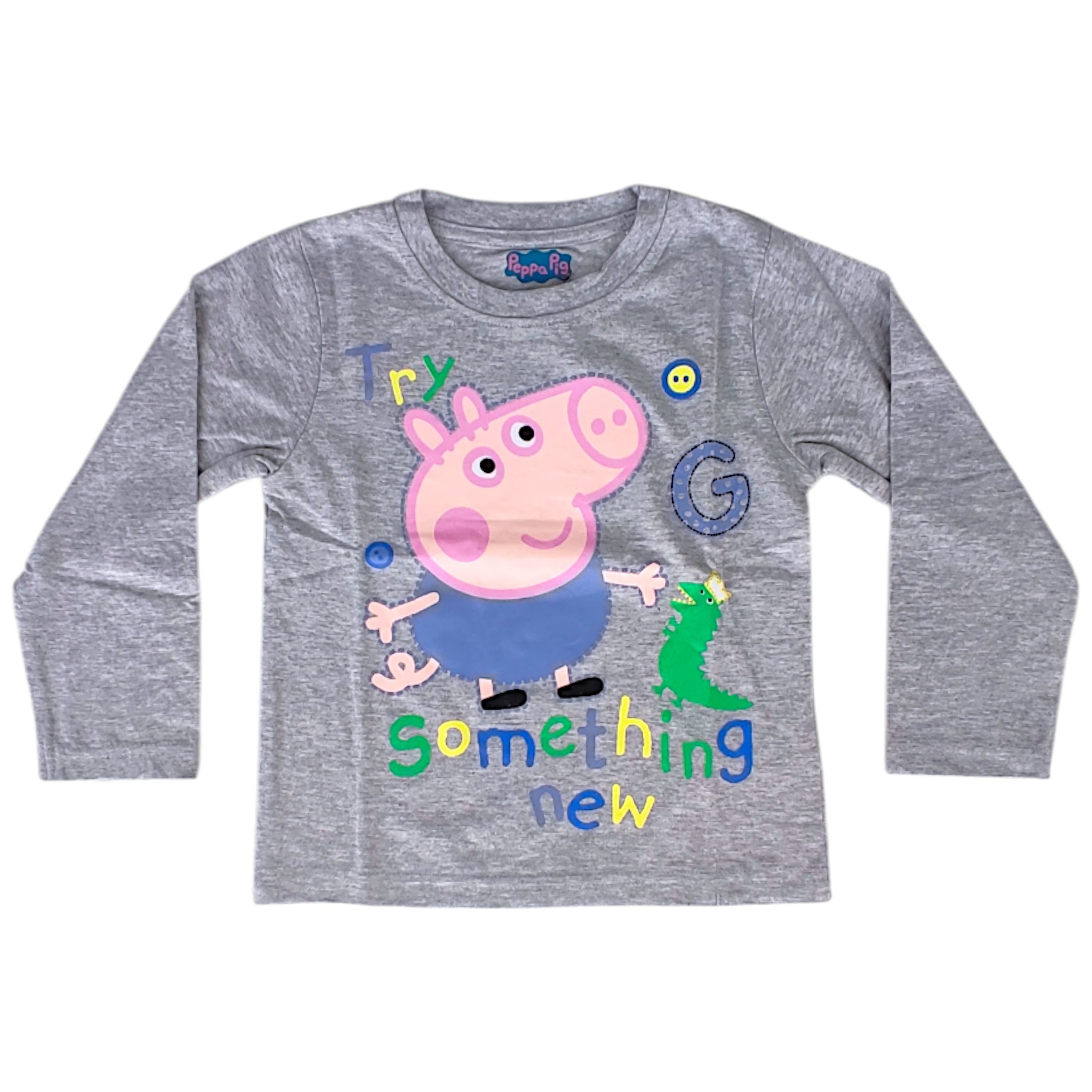 Dieses Langarmshirt ermutigt mit dem Spruch „Try something new“ spielerisch zur Neugier und zeigt George mit seinem lustigen Dino-Freund. Bunte Schriftzüge, kleine Knopf-Details und ein fröhliches Design machen das Shirt zu einem Hingucker im Alltag.