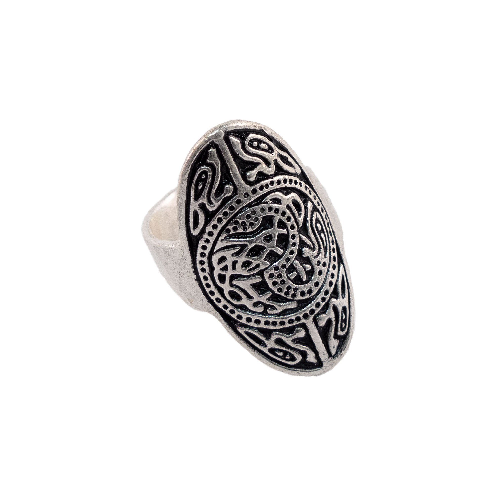 Diese detailgetreue Reproduktion eines angelsächsischen Fingerrings im Trewhiddle-Stil ist einem Relikt aus der frühen Wikingerzeit (775 - 850 n. Chr.) nachempfunden. Der originale Fingerring, aus Silber gefertigt, stammt aus einer englischen Werkstatt und wurde in der Themse bei Chelsea gefunden. Sein zoomorphes Design erinnert an Ringe aus dem 8. und frühen 9. Jahrhundert, insbesondere an angelsächsische Ringe im Trewhiddle-Stil. Das Victoria and Albert Museum in London ist heute stolzer Besitzer des ursprünglichen Rings.