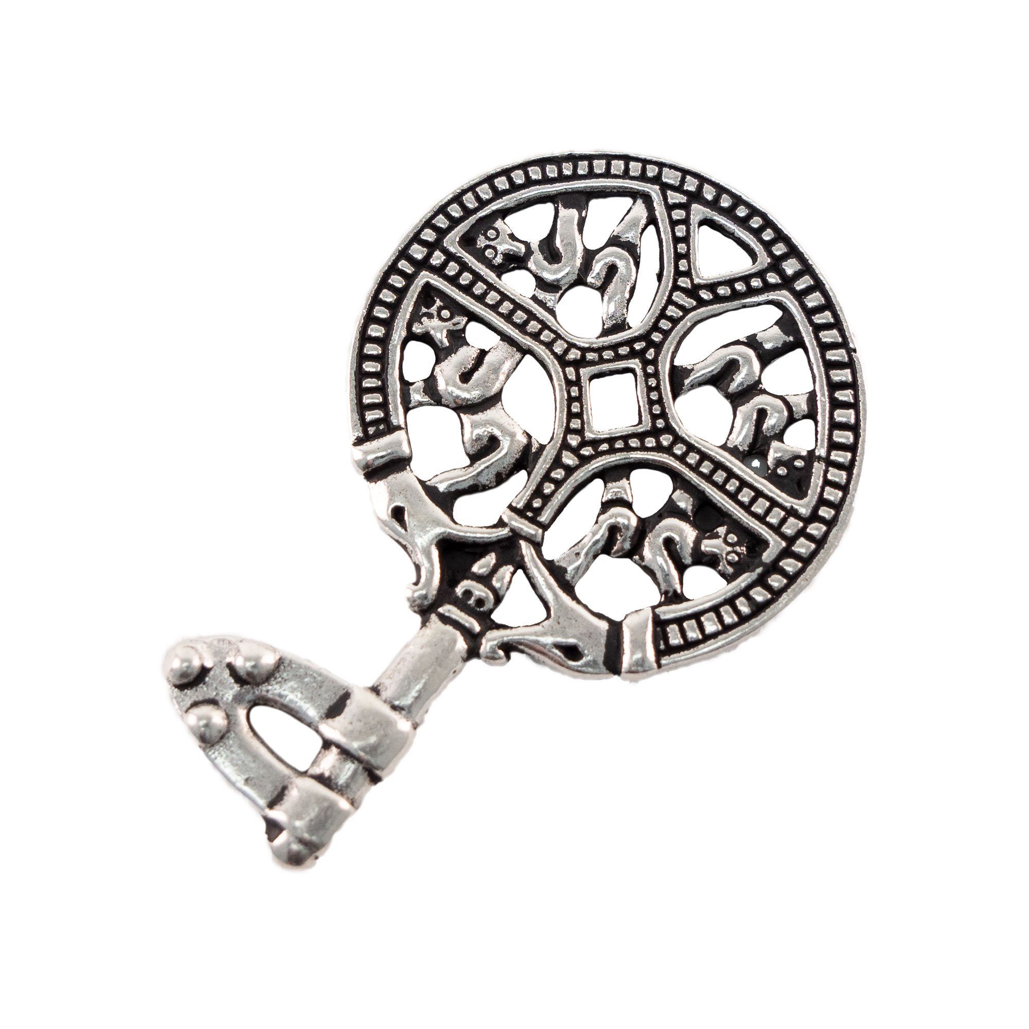 Dieser kunstvoll gearbeitete Wikingeranhänger, wurde von einem wikingerzeitlichen Fund aus dem 9. Jahrhundert im sogenannten Greiftier-Stils inspiriert. Das Original dieses Wikingerschlüssels ist im Dänischen Nationalmuseum ausgestellt, wo seine zeitlose Schönheit bewundert werden kann.