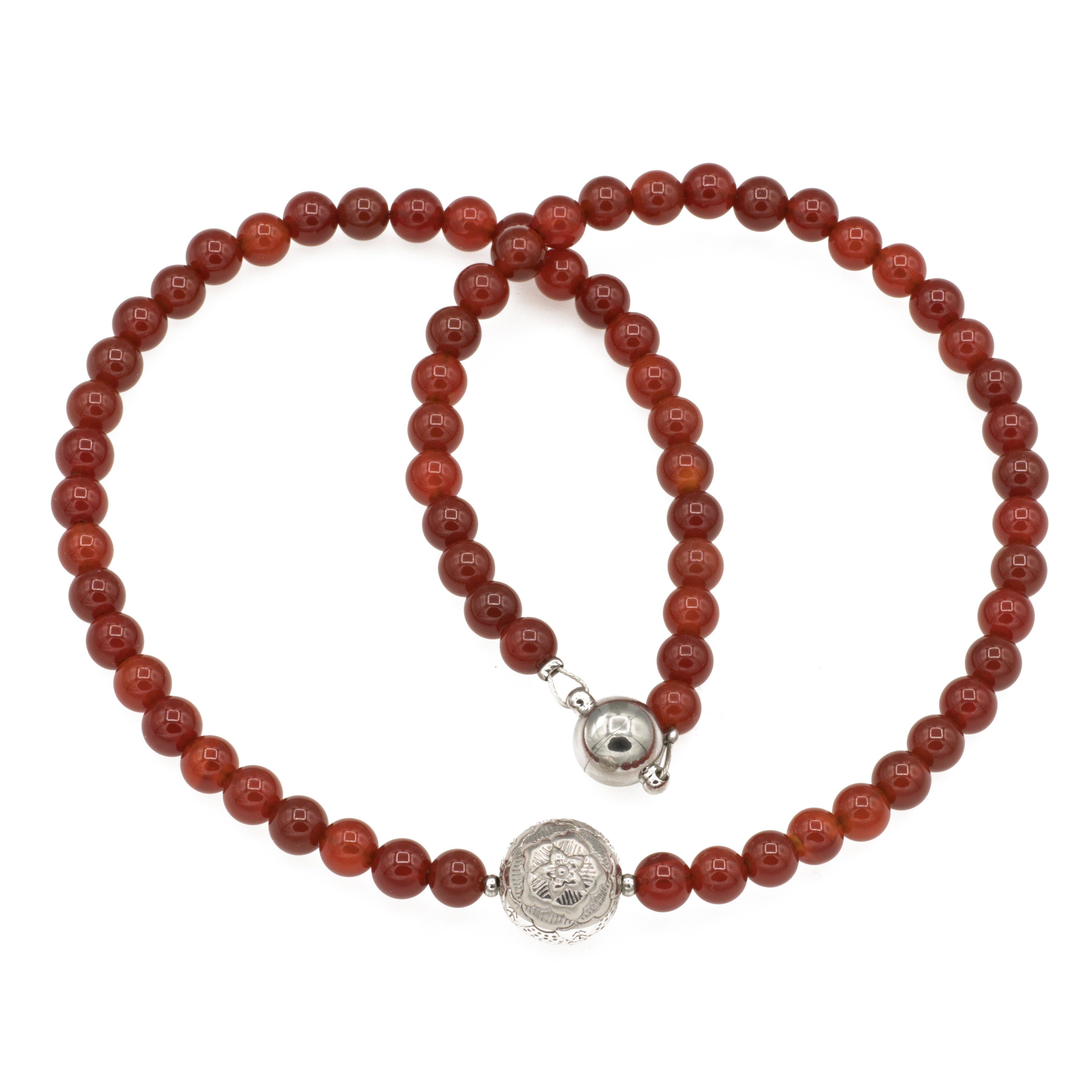 Kette mit 6 mm Karneol Perlen und 1 Perle aus 925 Silber anlaufgeschützt 13 mm Durchmesser. Kette mit 6 mm Karneol Perlen und 1 Perle aus 925 Silber anlaufgeschützt 13 mm Durchmesser
