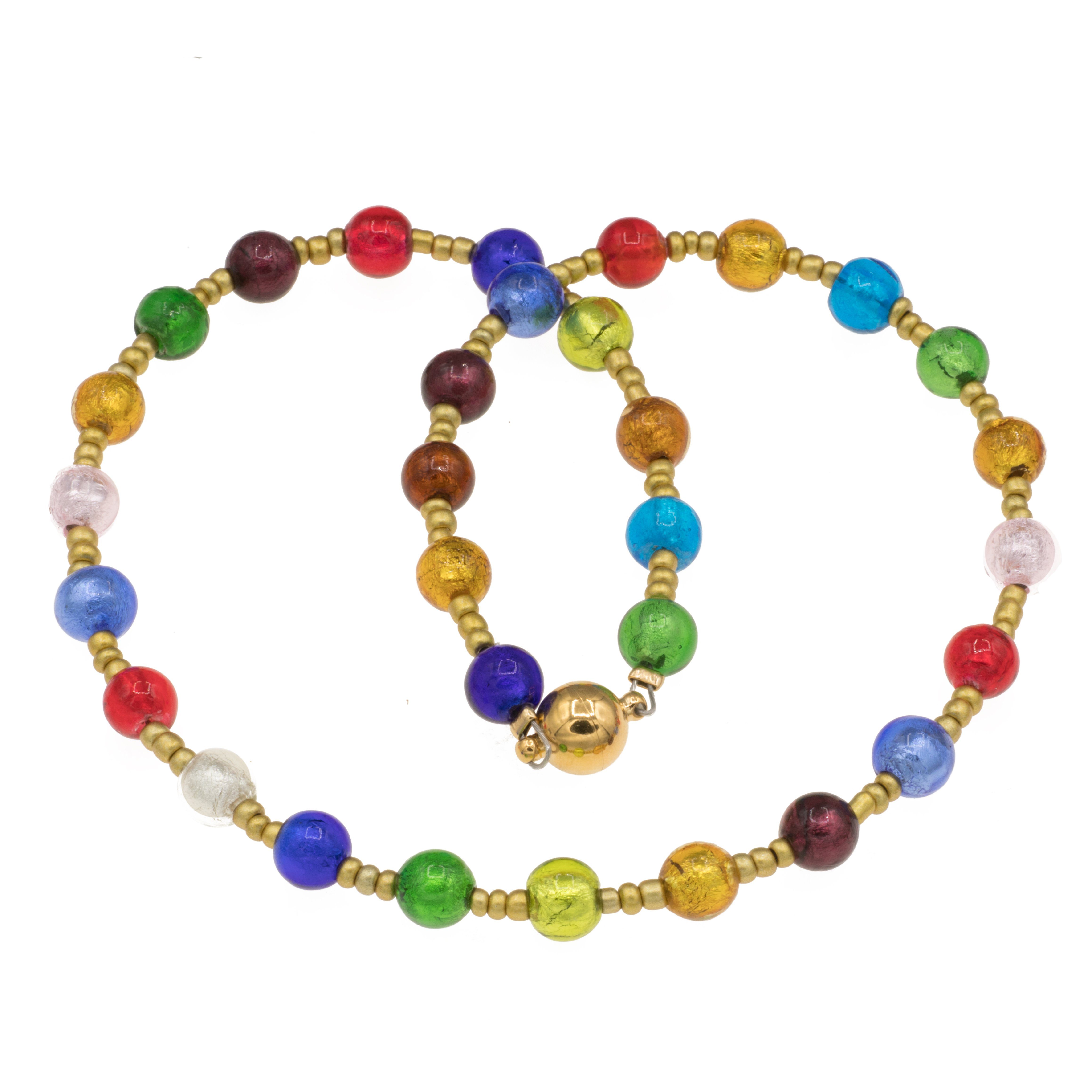 Kette mit bunten Murano Glas Perlen. Die 8 mm Perlen sind mit echter Goldfolie hinterlegt. Dazwischen sind kleine goldfarbene kleine Glasperlen gesetzt. Auf Juweliersdraht gezogen und mit einem Edelstahl Magnetverschluss versehen. In unserer Berliner Werkstadt gefertigt