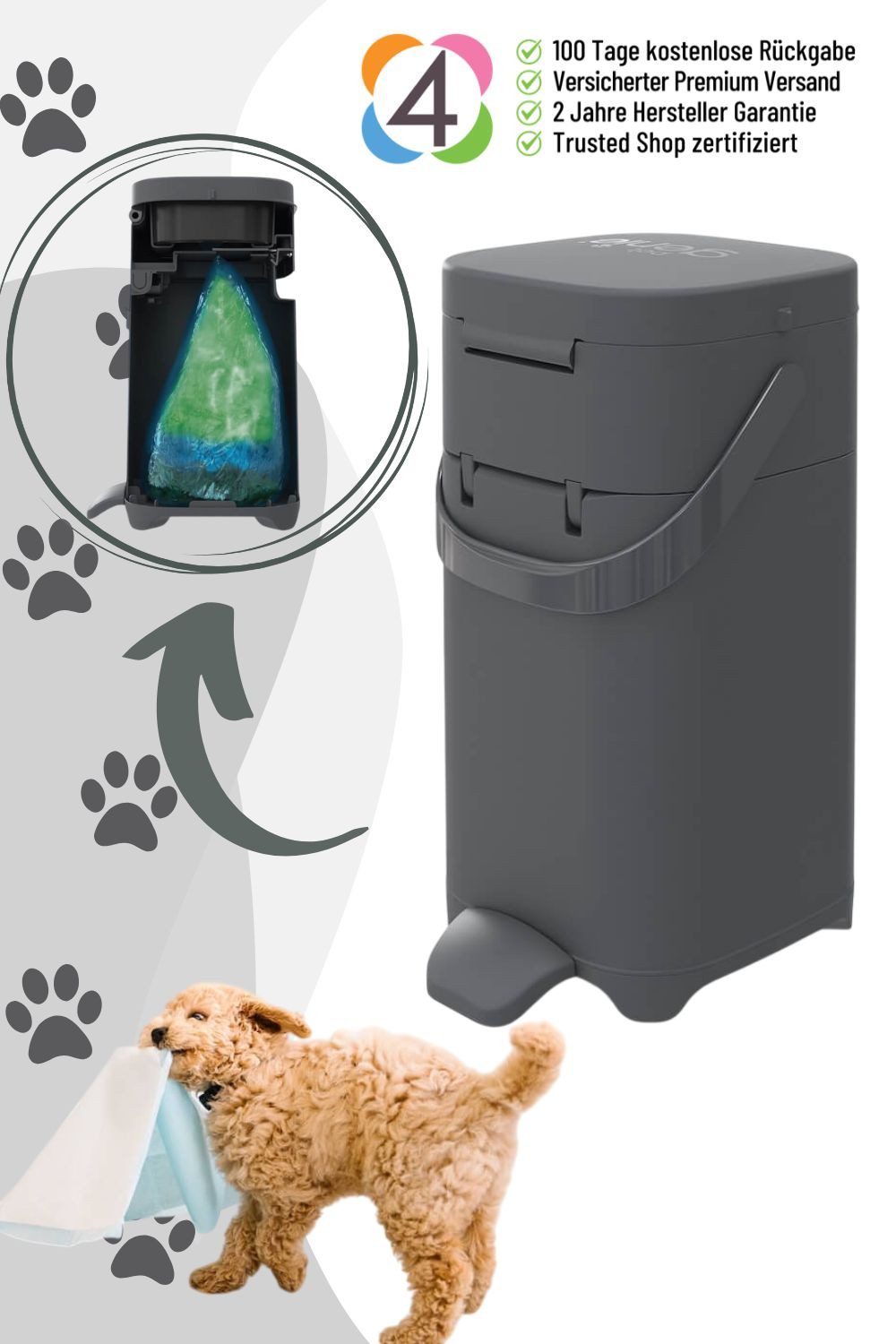 Ich bin das Pet Genie Hundekot-Entsorgungssystem und ich bin die ideale Lösung, um verschiedene Hundeabfälle wie Hundekot, Windeln und Trainingspads sauber und geruchssicher zu entsorgen. Mit meinem Verschluss-System halte ich unangenehme Gerüche sicher eingeschlossen und verhindere unbeabsichtigtes Öffnen des Deckels durch einen praktischen Griff. Meine breite Entsorgungsöffnung ermöglicht Euch ein sauberes Befüllen, während die mehrschichtige Nachfüllfolie mit geruchsbindender Barrieretechnologie (im Lieferumfang enthalten) bis zu 2 Monate hält. Das bedeutet weniger häufiges Nachfüllen und spart Euch den täglichen Gang zur Mülltonne. In mich passen bis zu 15 mittelgroße Hundewindeln oder 7 mittelgroße Trainingspads. Ihr könnt den Hundekot direkt in den Eimer geben und so die Verwendung von Hundekotbeuteln reduzieren. Vertraut auf mich, denn mit mir habt Ihr eine zuverlässige und praktische Lösung für die Entsorgung von Hundeabfällen.