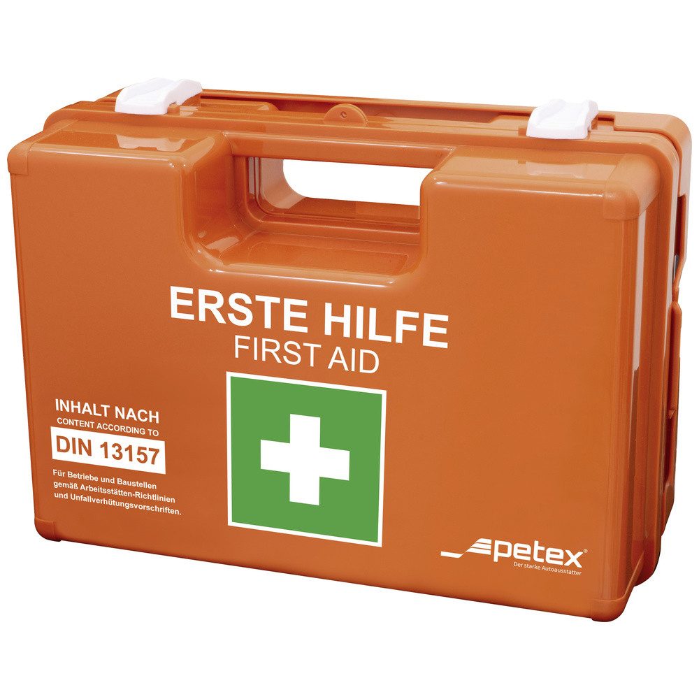 Der PETEX Betriebsverbandkasten "Profi" ist ideal für Unternehmen und Arbeitsumgebungen konzipiert worden. Gemäß den strengen Standards der DIN 13157:2021, ist dieser Kasten in auffälligem Orange gehalten, was seine Sichtbarkeit und Auffindbarkeit im Notfall deutlich verbessert.