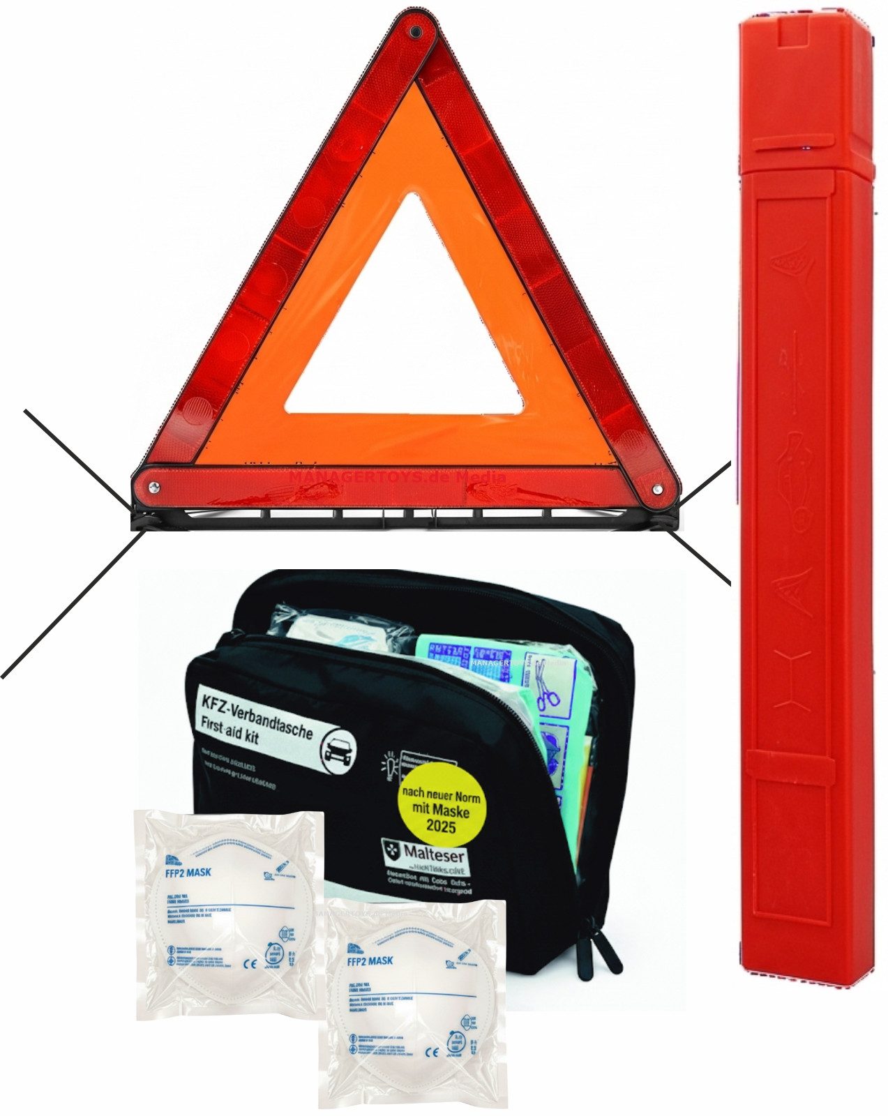 MIt diesem Set erhalten Sie zwei FFP2 Masken zusätzlich. Die Verbandtasche beinhaltet den aktuell vom Gesetzgeber geforderten Inhalt (Verbandszeug u.a. sowie 2x Mundschutz) und eine Broschüre mit Erste-Hilfe-Hinweisen. Für den Fall eines Unfalls ist der Inhalt schnell griffbereit. Mit einem Reißverschluß rundum lässt sich die Tasche (aus Nylongewebe) optimal im Auto verstauen.