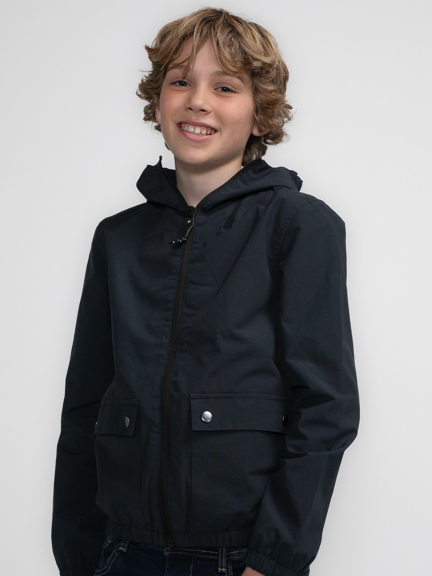 Leichte Jacke mit Reißverschluss und Kapuze. Diese Jacke hat zwei Pattentaschen an den Hüften und eine Innentasche. Hergestellt aus 60 % Baumwolle und 40% Polyester.