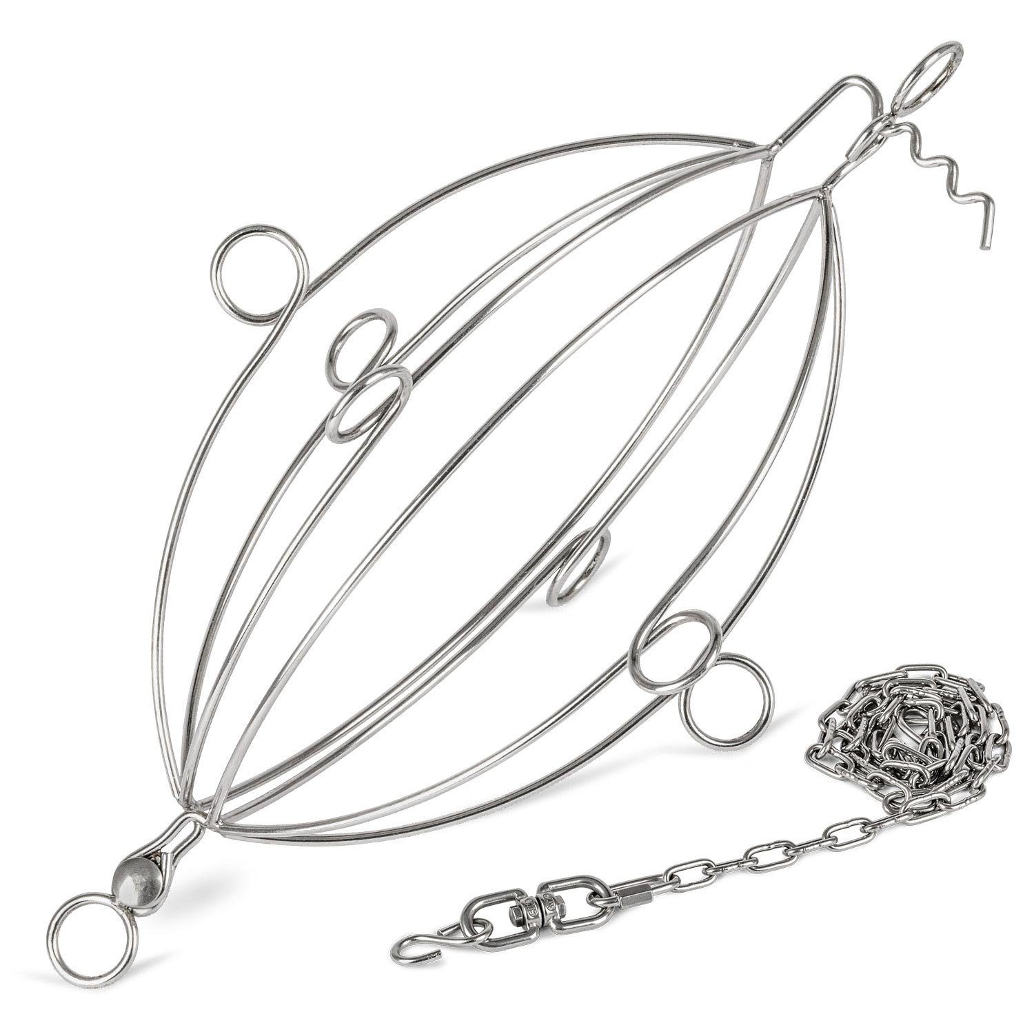 Petromax Geflügelkorb aus Edelstahl Im Geflügel-Grillkorb gart ein ganzes Hähnchen schwebend über dem Feuer. An einer langen Kette hängt das Hähnchen an einem Petromax Dreibein oder an der Petromax Feuerbrücke. Für die Regulierung der Temperatur können die einzelnen Glieder der Kette genutzt werden. So wird, im wahrsten Sinne des Wortes, beim Garen ein Zahn zugelegt. Ein Drehwirbel unterstützt das gleichmäßige Grillen. An den Ösen aufgehängt, kann der Draußen-Koch das Huhn per Hand stets Stück für Stück weiterdrehen. Von allen Seiten gart es würzig-knusprig und wird innen herrlich saftig. In den Grillkorb kann Geflügel von unterschiedlicher Размер gelegt werden, denn durch den wellenförmigen Haken wird der Grillkorb individuell passend verschlossen. So können sowohl Hähnchen als auch kleine Enten mit dem Geflügel-Grillkorb gegrillt werden. Mit einer Gesamtkettenlänge von 95 cm sind unterschiedliche Befestigungsmöglichkeiten, wie z.B. an der Petromax Feuerbrücke oder am Dreibein, möglich. Der Geflügel-Grillkorb besteht aus reinem Edelstahl. Er lässt sich mit einem weichen, feuchten Schwamm und etwas Spülmittel ganz einfach reinigen. Das Geflügel kann vor dem Grillen mit unterschiedlichen Kräutern, Gewürzen, Salz und Zucker eingerieben werden. Jegliche Füllung ist möglich und verleiht dem Fleisch die eigene, individuelle Note. Der charakteristische Rauchgeschmack macht das Gericht zu etwas Ursprünglichem, das man gerne mit anderen teilt. Technische Daten Material: Edelstahl H x B x T (in cm): 35,5 x 20,2 x 18,5 Gewicht (in g): 400