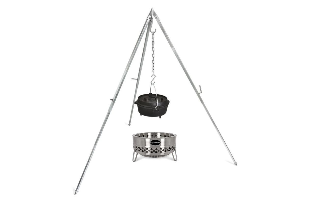 Das Petromax Aktionsset 3T beinhaltet ein Dreibein inkl. Hängerost, Feuertopf ft9 und der Feuerstelle Tyropit. Dieses Set ist der perfekte Begleiter für Ihren Urlaub in der Natur.Die Feuerschale Tyropit bringt das authentische Lagerfeuer für echte Wildnis-Atmosphäre nach Hause in deinen Garten und sorgt für raucharmes Vergnügen. Perfekt für gesellige Abende oder romantische Nächte, eignet sich auch hervorragend als Basis zum Kochen und Grillen. Erlebe mit der Feuerschale Tyropit die Magie eines echten Lagerfeuers in deinem Garten. Das authentische Flammenbild-Design sorgt für eine Wildnis-Atmosphäre, die jeden Abend besonders macht. Dank cleverer Konstruktion und effektiver Sekundärverbrennung genießt du eine raucharme und gleichmäßige Verbrennung mit minimalen Ascherückständen.Der integrierte Hitzeschild reduziert die Hitze nach unten und schützt deinen Boden vor Beschädigungen. Hochwertiger Edelstahl im minimalistischen Design kombiniert Natürlichkeit mit stilvollem Look. Die Feuerschale ist robust und langlebig, entwickelt mit der Zeit eine einzigartige Patina und hat dank drei stabilen Standfüßen einen sicheren Halt auf jedem Untergrund. Die Tyropit Feuerschale ist vielseitig einsetzbar - perfekt als Basis zum Kochen und Grillen, erweiterbar mit einer Grillplatte und kompatibel mit einer Vielzahl anderer Petromax Produkte (z.B. Guss, Perkolatoren, Lagerfeierspießen, Waffeleisen uvm.). Genieße gesellige Abende beim Essen, melancholische oder romantische Momente am Lagerfeuer - allein oder in der Gruppe. Bringe mit der Tyropit Edelstahl-Feuerschale deine Liebsten für unvergessliche Lagerfeuerabende zusammen oder genieße die entspannte Atmosphäre ganz für dich allein. Erlebe die Wärme und Vielfalt des Feuers und schaffe unvergessliche Erinnerungen.Der Hänge-Rost für das Petromax Dreibein erweitert ihre Draußen-Küche um ursprüngliche Grillerlebnisse am Lagerfeuer. Mittels der drei stabilen Ketten wird der verchromte Stahlrost mit einem Handgriff an ihren Dreibeinhaken gehängt und ist direkt einsatzbereit. Den Abstand zu ihrer Kochstelle regeln Sie dabei bequem über die Kettenlänge des Dreibeins. Durch die natürliche Pendelbewegung wird ihre stärkende Mahlzeit immer nur in Intervallen den lodernden Flammen ausgesetzt und gart damit schonend. Steaks, Filets und sogar Gemüse nehmen das intensive Aroma des Holzfeuers an und bekommen durch die Roststruktur das typische Grillmuster, bleiben dabei aber besonders saftig. Der erhöht umlaufende Rand des Hänge-Rostes schützt zeitgleich vor dem Herabfallen der Speisen. So können Sie ihrer Grillfläche noch einen zusätzlichen Schwung geben und in den Genuss des Schwenkgrillens kommen. Mit einer Fläche von 50 cm im Durchmesser haben Sie auch ausreichend Platz für die feurigsten Fleischgerichte und füllen so einige hungrige Mägen. Kommen Sie auf den Geschmack des ursprünglichen Grillens mit Feuer mit dem Hänge-Rost von Petromax!Der originale Petromax Feuertopf ft9-t, oft auch als Dutch Oven bezeichnet, eignet sich ideal für das Kochen und Backen im Freien oder im heimischen Backofen. Gusseiserne Töpfe existieren seit dem 18. Jahrhundert. Durch die hervorragenden Eigenschaften des Gusseisens und die spezielle Oberflächenstruktur wird die Wärme effizient gespeichert und weitergeleitet.