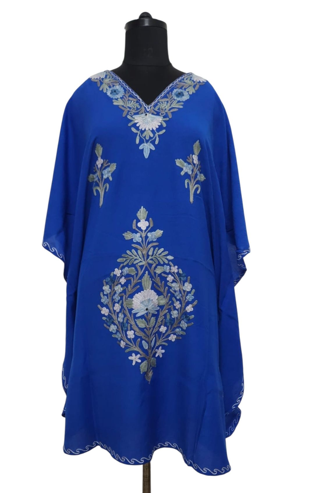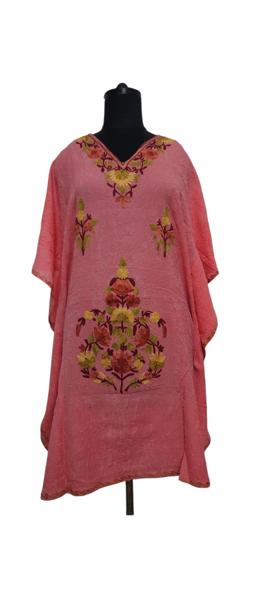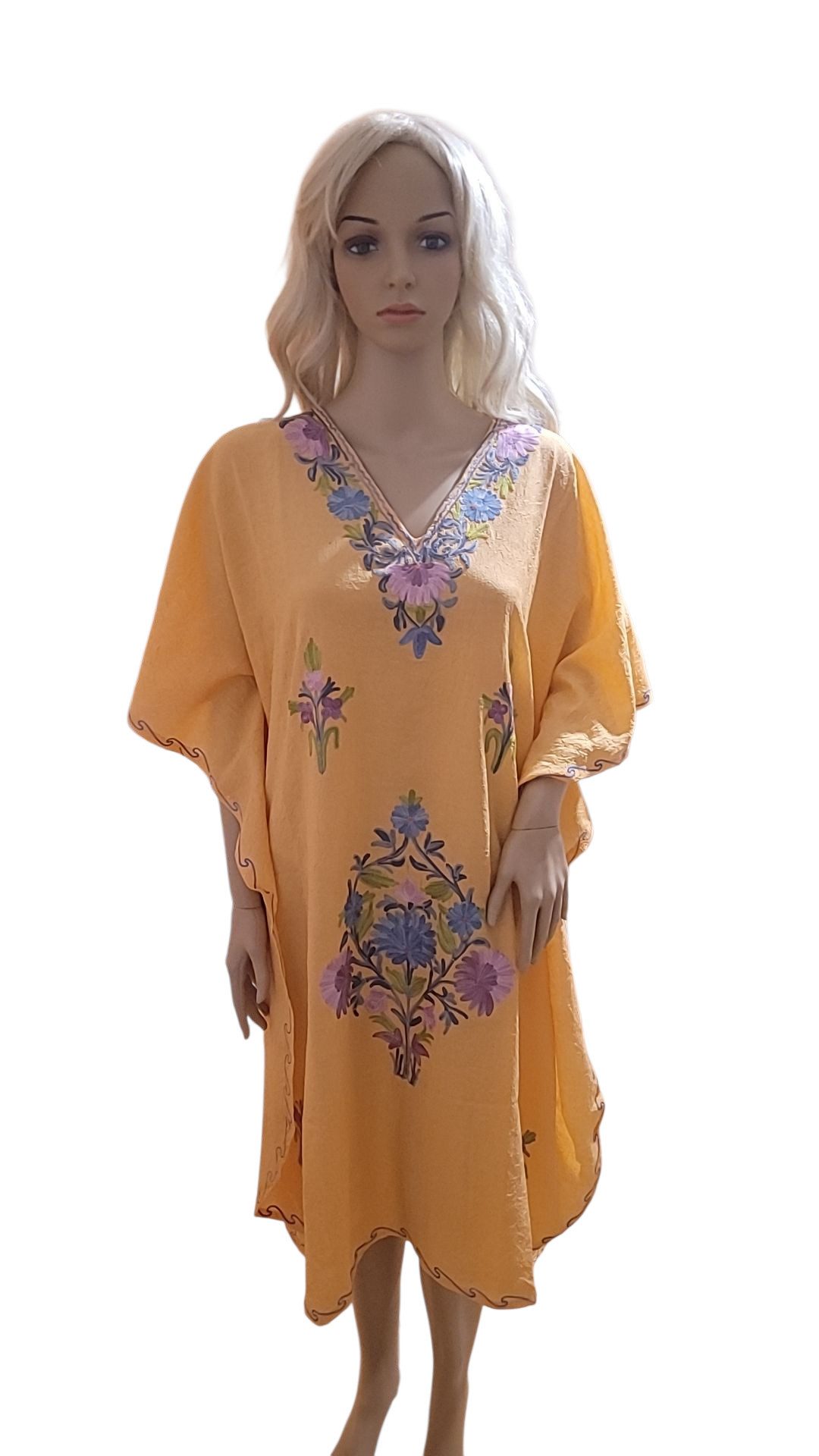 Strahlen Sie Eleganz aus in unserem bezaubernden Kaftankleid, ein Meisterwerk der aufwendigen Stickerei auf hochwertiger Crash-Baumwolle. Die lebendigen Farben und der tiefe Ausschnitt strahlen Raffinesse aus und sorgen dafür, dass Sie bei jeder Veranstaltung glänzen. Dieses vielseitige Stück wurde für Komfort und Stil gefertigt und bietet endlose Styling-Optionen, eine zeitlose Ergänzung Ihrer Garderobe. Erhöhen Sie mühelos Ihren Sommerstil mit unserer exklusiven Kollektion eleganter Kaftankleider, die jeweils ein wahres Kunstwerk sind, das Sie in königlicher Eleganz hervorhebt. Bitte beachten Sie, dass es aufgrund der Beleuchtung beim Fotografieren zu leichten Farbabweichungen kommen kann.