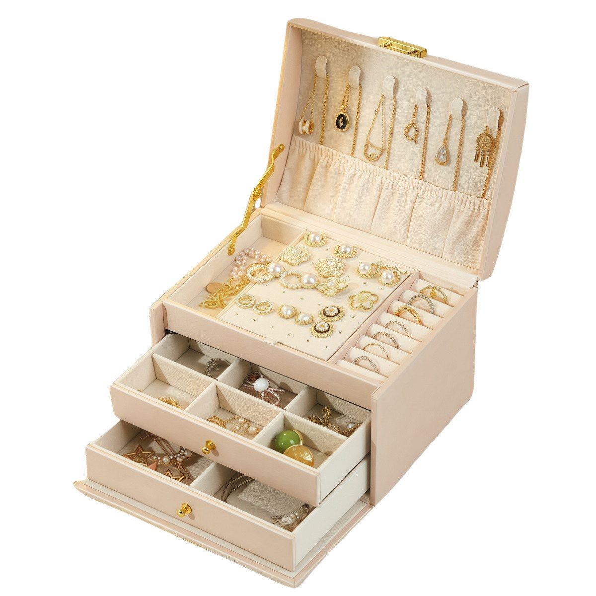 Dieses hochwertige Schmuckkästchen ist nicht nur ein einfaches Aufbewahrungsinstrument, sondern auch ein Kunstwerk. Es kombiniert die luxuriösen Materialien Regennarbenleder und Samt und bietet drei elegante Farbvarianten - dunkelgrün, beige und hellrosa - um den individuellen Bedürfnissen der verschiedenen Benutzer gerecht zu werden. Ob für den täglichen Gebrauch oder als wertvolles Geschenk, er verleiht Ihrem Leben einen Hauch von Raffinesse und Eleganz.