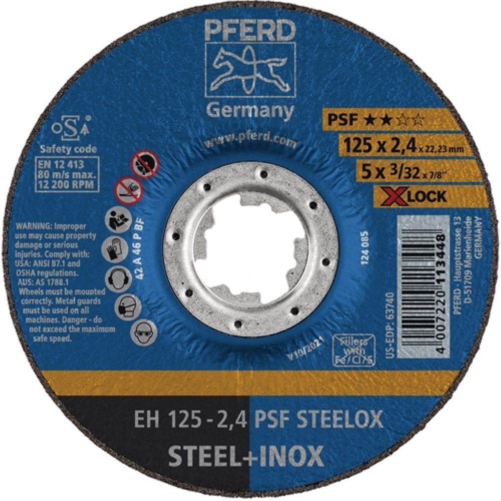 Trennscheibe X-LOCK PSF STEELOX D125x2,4mm ger.INOX Bohr.22,23mm PFERD zum schnellen und kühlen Trennen von Blechen, Profil- und Vollmaterial aus Edelstahl (INOX) und Stahl · hohe Trennleistung und gute Standzeit · ohne eisen-, chlor- und schwefelhaltige Füllstoffe · Scheibenstärke 2,4 mm für universelle Trennaufgaben · mit X-LOCK Aufnahme für den schnellen und einfachen Werkzeugwechsel (Bohrung 22,23 mm Ø) Впередe technische Eigenschaften: · max. Drehzahl: 12200min-¹