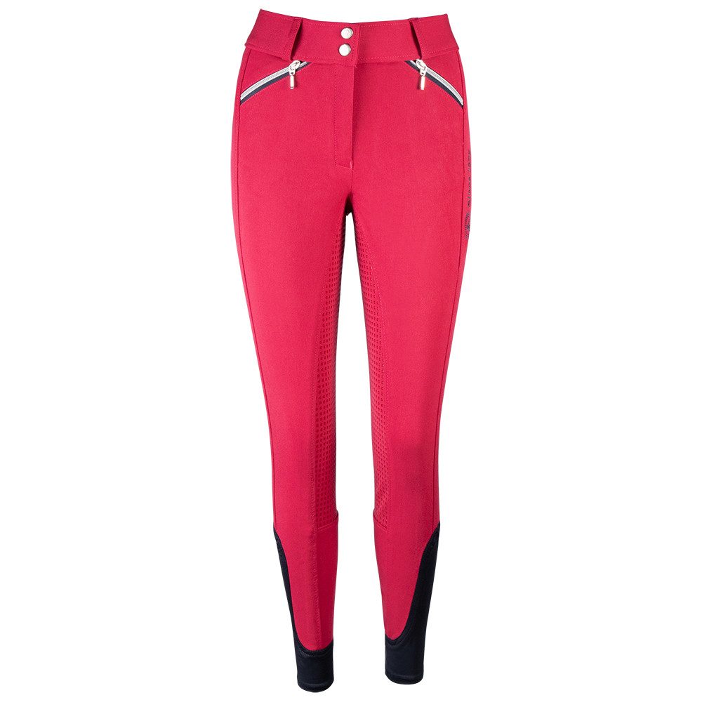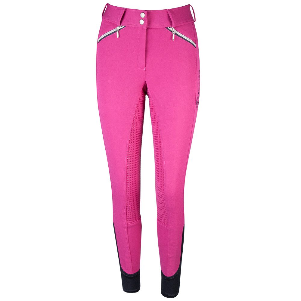 Modische Grip-Reithose mit breitem Bund und vielen Details. Diese Reithose verfügt neben einem Vollbesatz aus Grip-Material über viele farblich abgesetzte Details. Neben den vier Reißverschlusstaschen geben ihr farbige Nähte und ein aufwendig gestaltetes Logo am Oberschenkel einen einzigartigen Look. Für Bequemlichkeit sorgen der breite, elastische Bund mit zwei Knöpfen und Gürtelschlaufen, sowie die elastischen Beinabschlüsse.