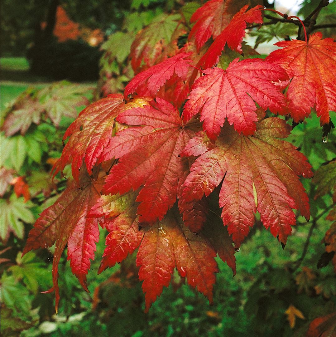 Großblättriger Fächerahorn mit traubenblattartigem Laub und spektakulärer Herbstfärbung von Orange bis Scharlachrot