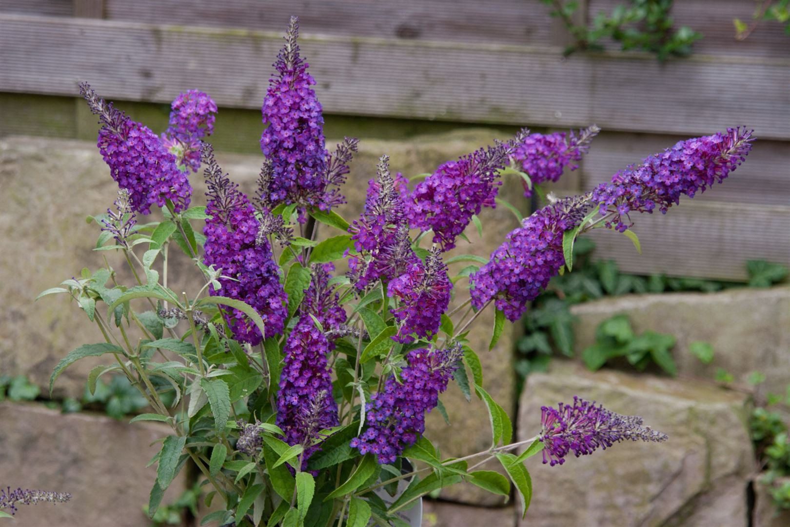 Kompakter Zwerg Sommerflieder mit purpurvioletten duftenden Blueten von Juli bis September ideal fuer kleine Gaerten
